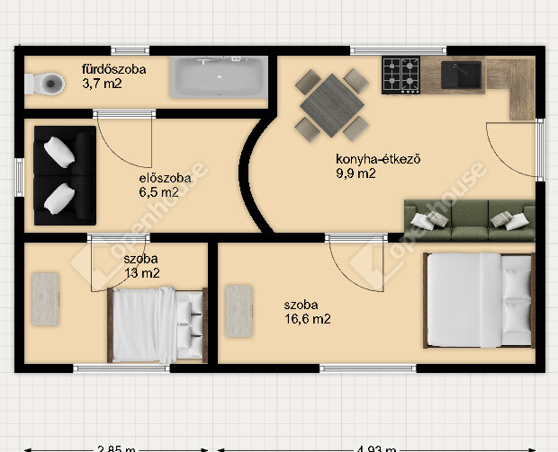 - 2 szoba, előszoba, konyha, fürdőszoba található