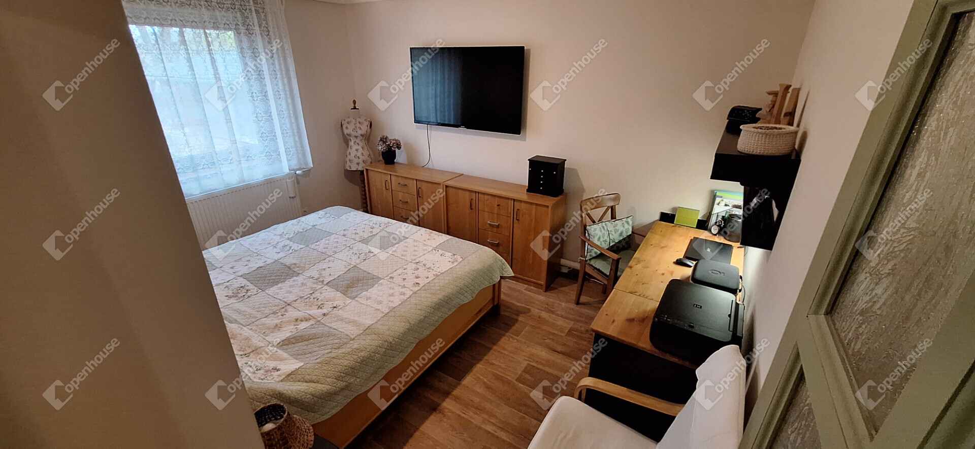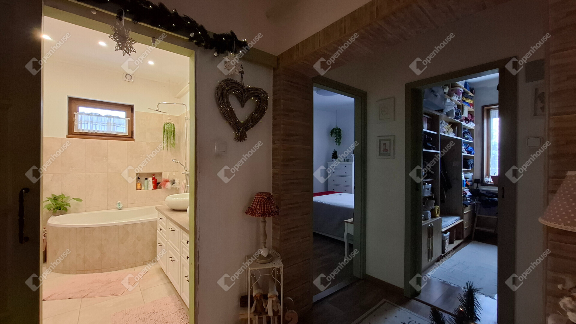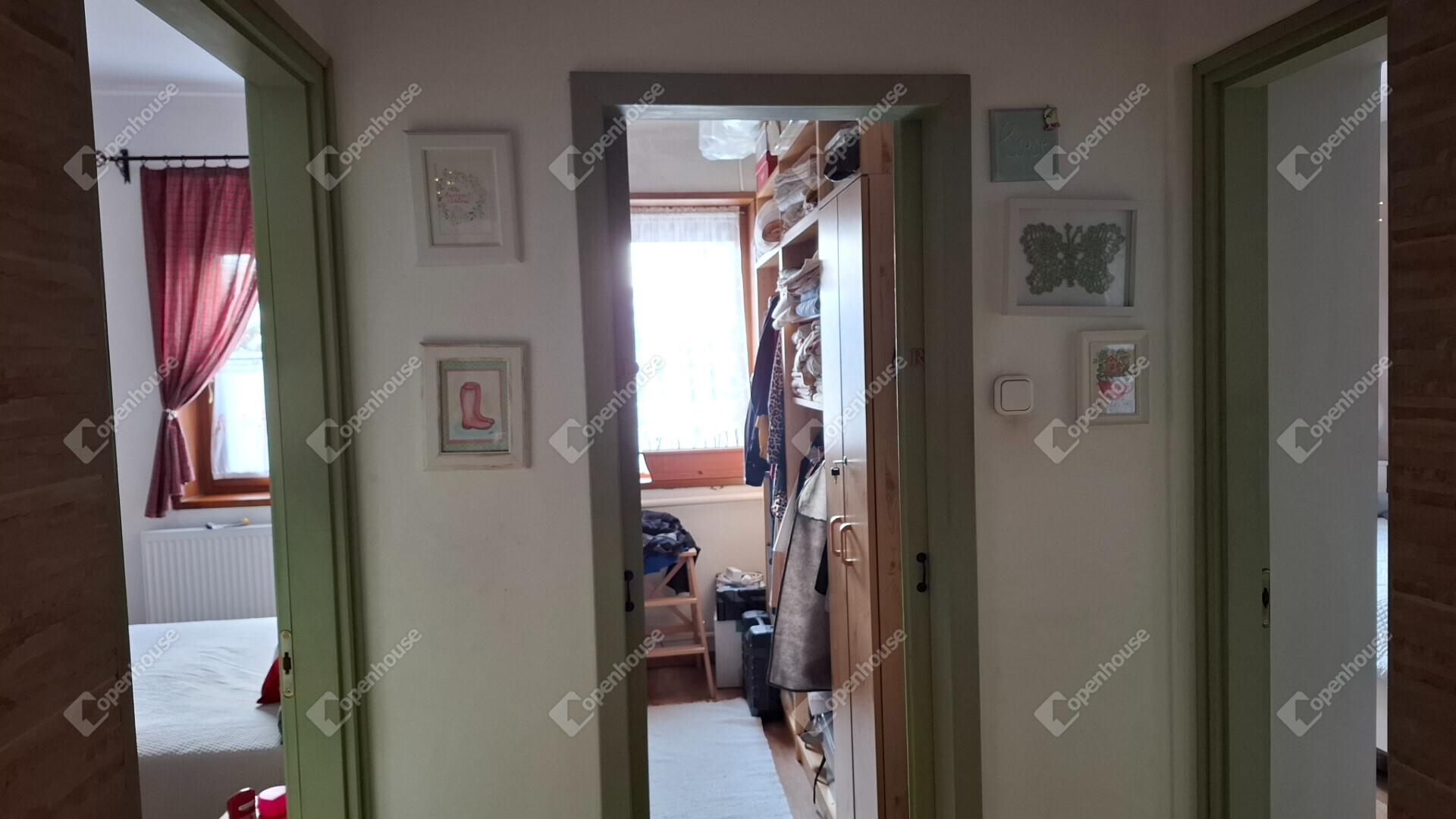 A házba belépve egy tágas előszoba fogad, található három külön nyíló hálószoba, egy amerikai konyha - étkezős nappali, egy nagy méretű kamra és egy gardrób szoba.