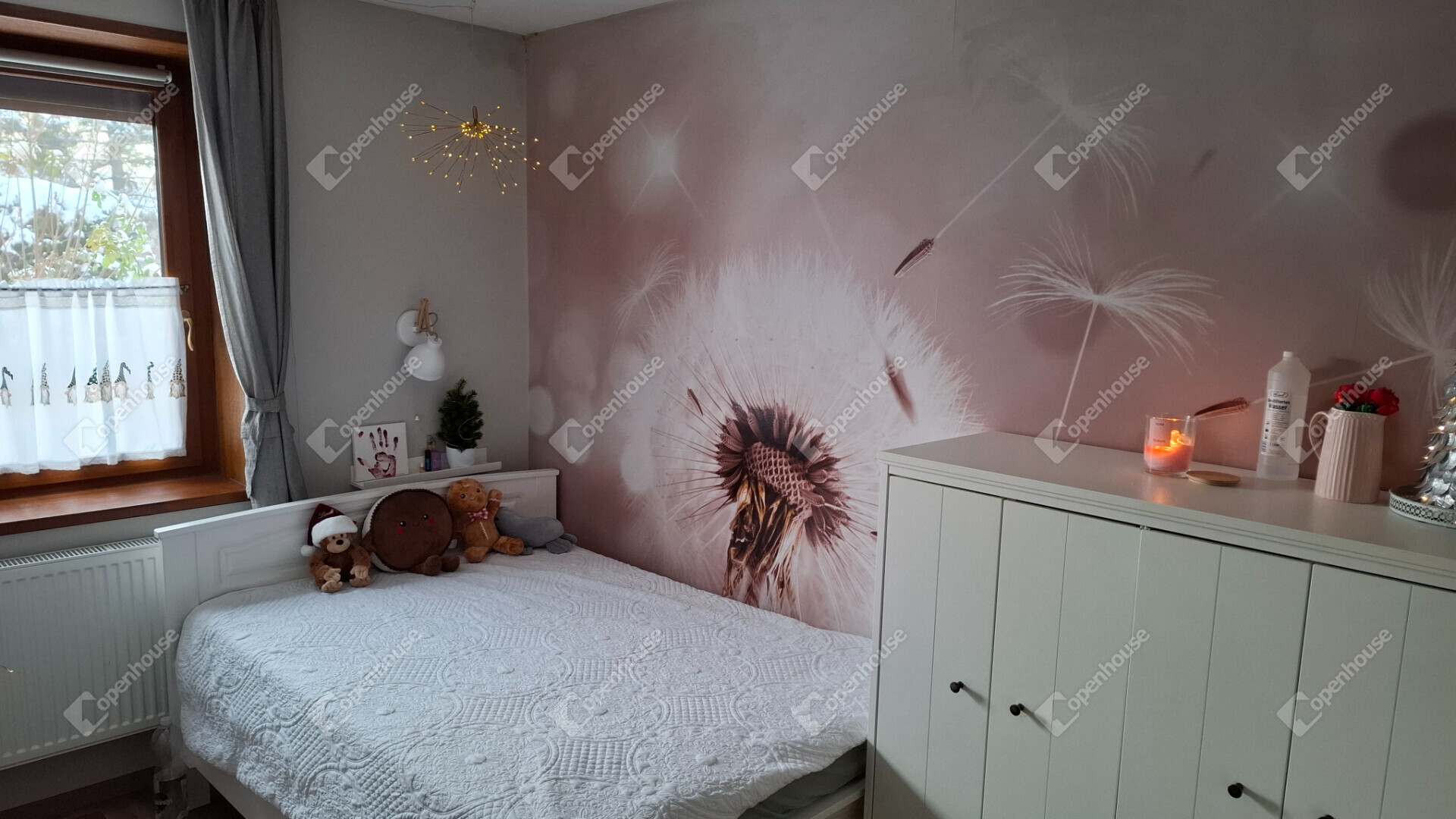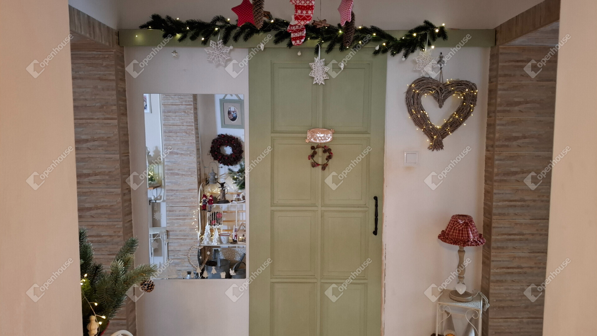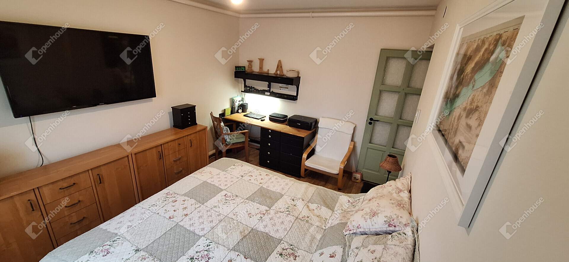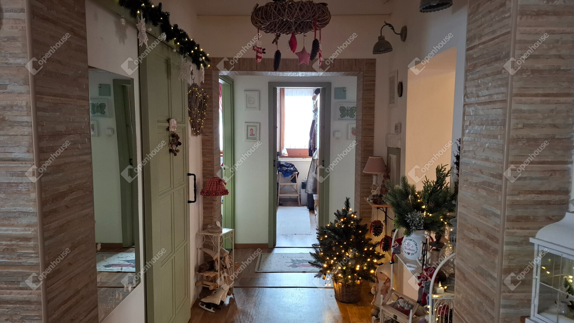 A házba belépve egy tágas előszoba fogad, található három külön nyíló hálószoba, egy amerikai konyha - étkezős nappali, egy nagy méretű kamra és egy gardrób szoba.