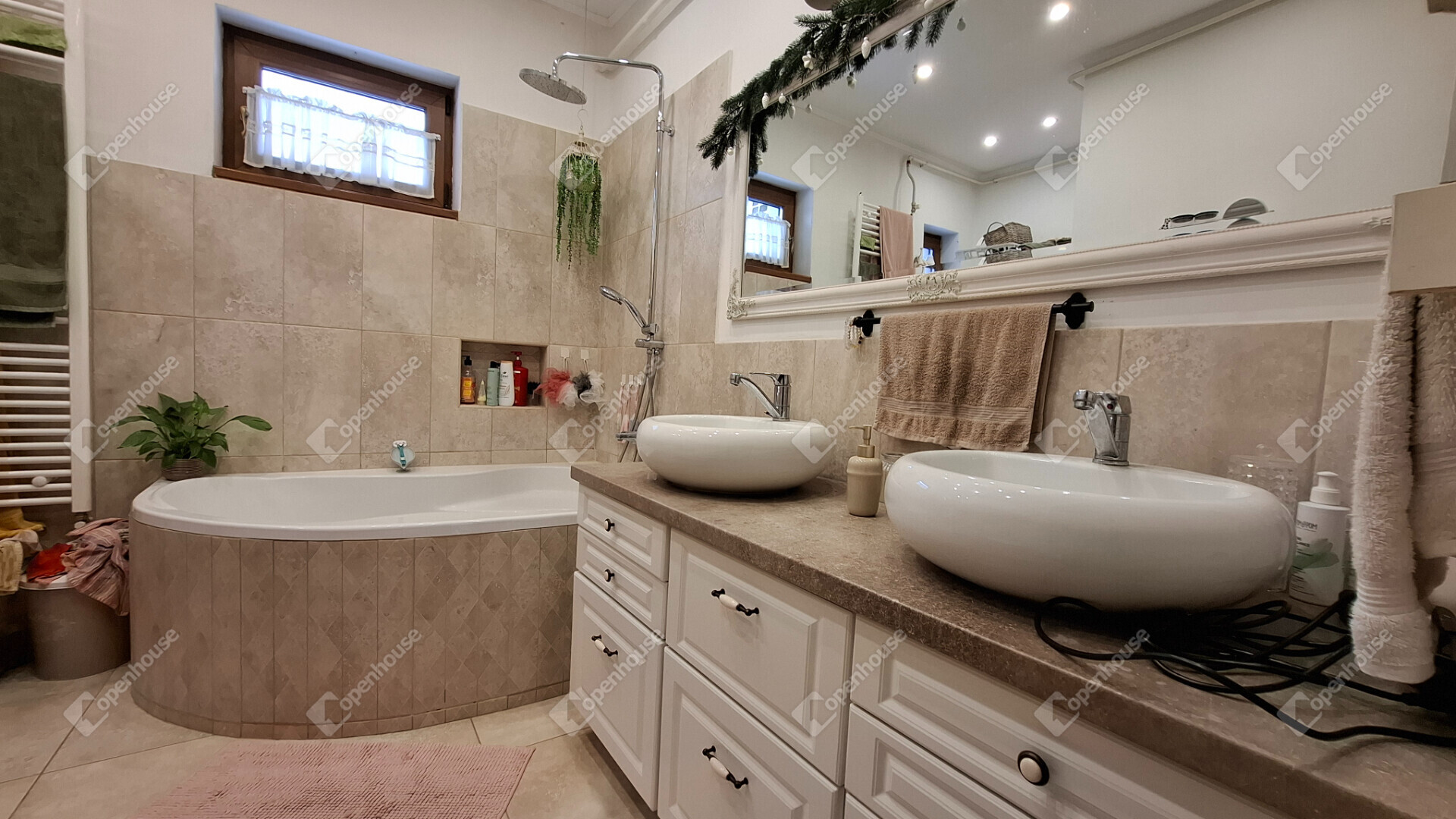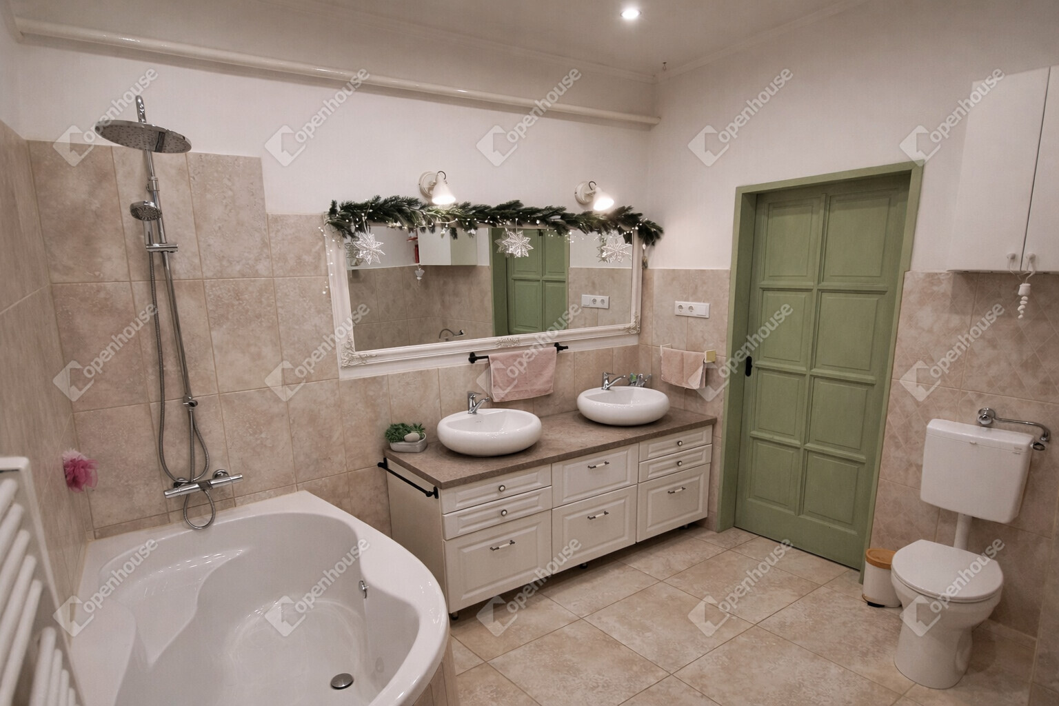 A fürdőszoba kényelmes méretű, sarokkádas kialakítású, két különálló mosdókagylóval rendelkezik, plusz egy wc külön helyiségben.