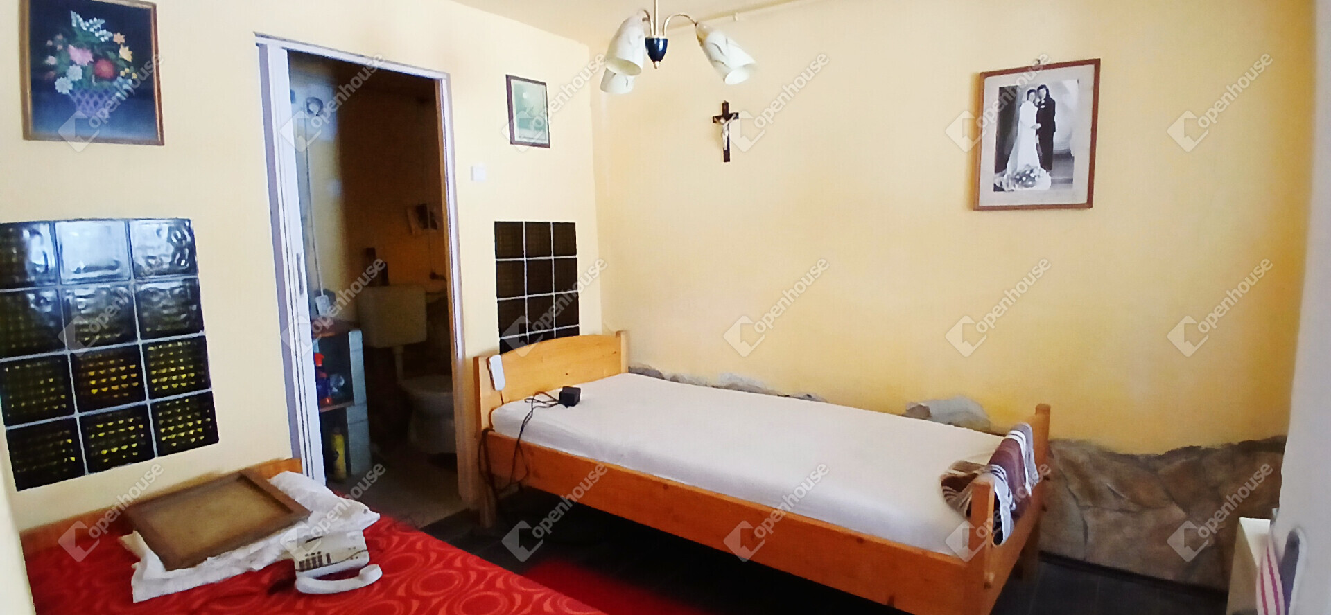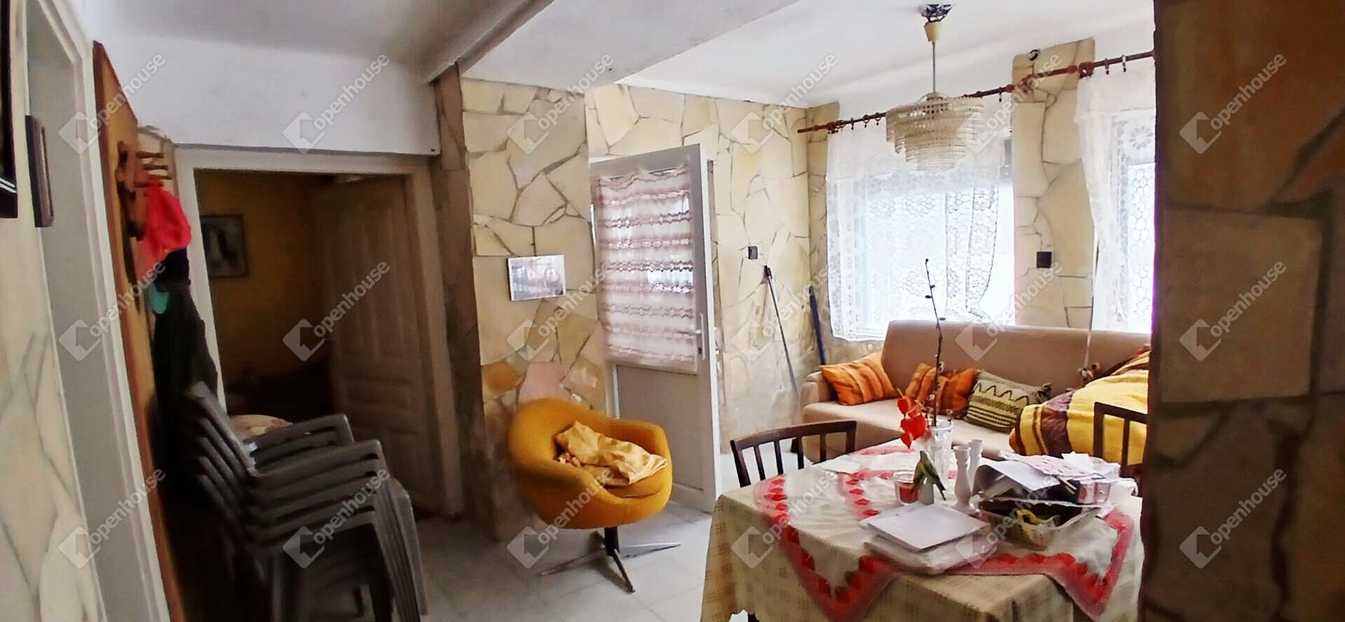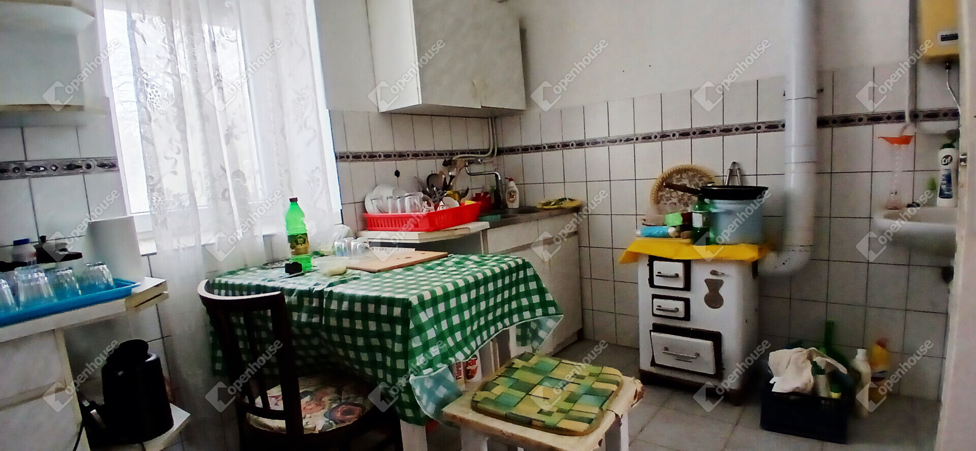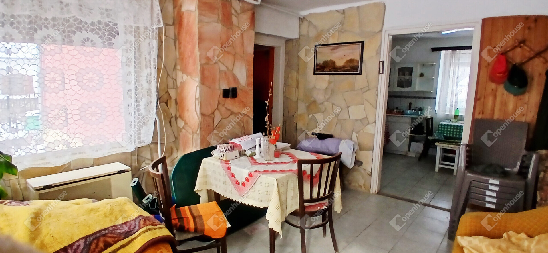 A ház elrendezése praktikus és otthonos, az előszobából a konyhába és a két szobába jutunk, a hálószobából pedig közvetlenül nyílik a tusolóval és WC-vel ellátott fürdőszoba. A stukatúr födém, a cserépfedés és a részben megmaradt eredeti fa nyílászárók a régi parasztházak varázsát idézik, miközben a laminált padló és a műanyag ablakok már a kényelmet szolgálják. A fűtésről gázkonvektor gondoskodik, de egy cserépkályha is rendelkezésre áll, amely nemcsak meleget, hanem igazi vidéki hangulatot is ad a téli estéken.