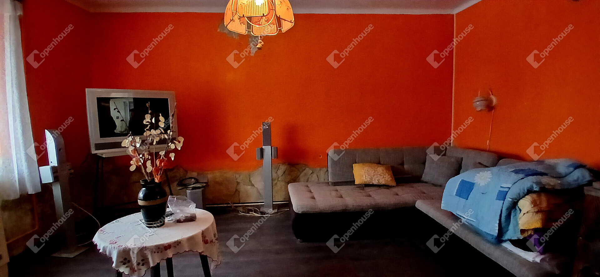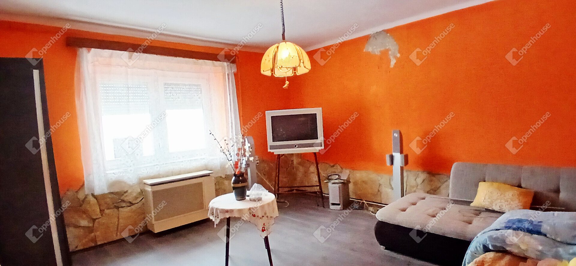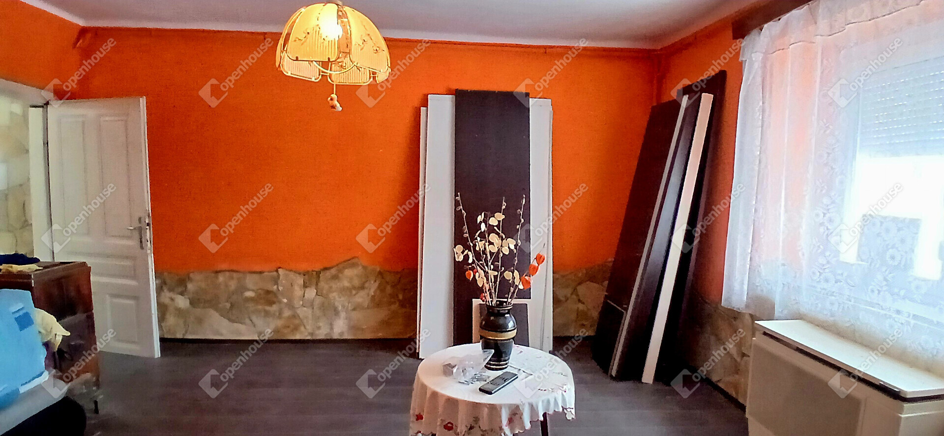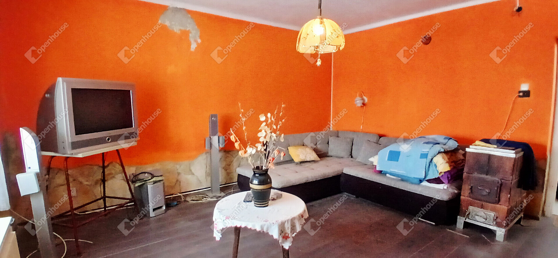 A ház elrendezése praktikus és otthonos, az előszobából a konyhába és a két szobába jutunk, a hálószobából pedig közvetlenül nyílik a tusolóval és WC-vel ellátott fürdőszoba. A stukatúr födém, a cserépfedés és a részben megmaradt eredeti fa nyílászárók a régi parasztházak varázsát idézik, miközben a laminált padló és a műanyag ablakok már a kényelmet szolgálják. A fűtésről gázkonvektor gondoskodik, de egy cserépkályha is rendelkezésre áll, amely nemcsak meleget, hanem igazi vidéki hangulatot is ad a téli estéken.