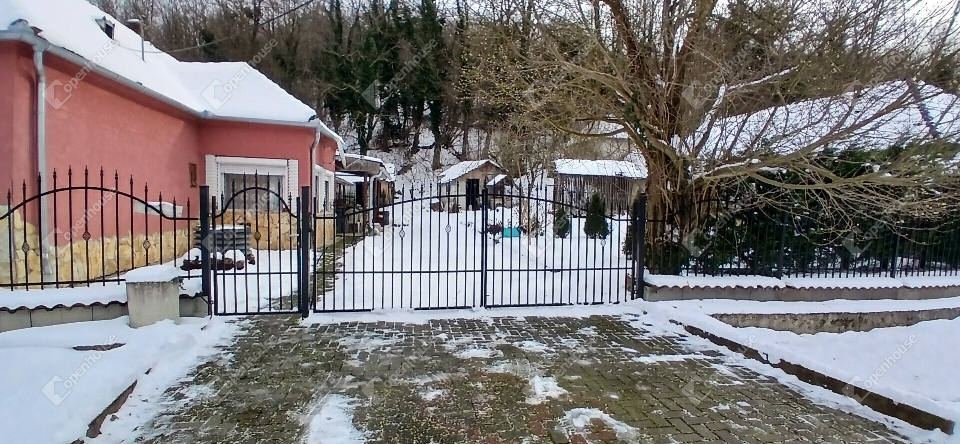 Az udvar térkövezett, az utcafronton kovácsoltvas jellegű kerítés fogadja az érkezőt. Az ingatlan két helyrajzi számon fekszik, a ház mögött akácos, fásított terület húzódik, ahol elképzelhető egy kerti pihenő, tűzrakóhely vagy akár egy kis gazdaság is. A melléképületekben nyári konyha és fürdőszoba található, melyek felújítást igényelnek, így új tulajdonosuk saját elképzelései szerint alakíthatja ki őket.