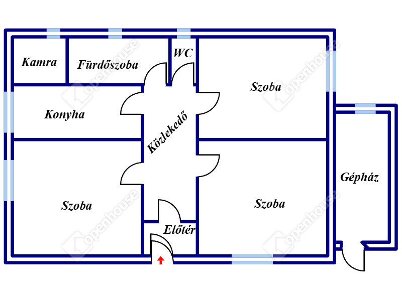A házba belépve az előtér fogad, ami egy közlekedőben folytatódik. Az ingatlan minden helyisége innen nyílik, nevezetesen a három különálló szoba, a fürdőszoba, egy wc és a konyha. A konyhából egy kis kamrába juthatunk. A fürdő tágas, zuhanyzós kialakítású.