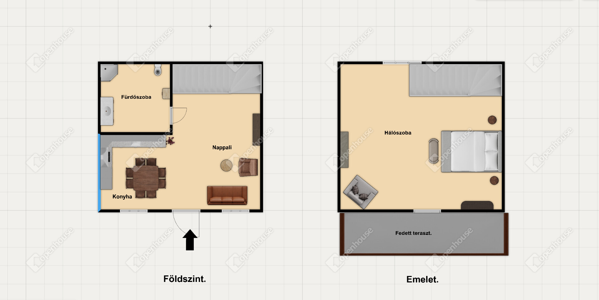 a földszinten nappali-konyha és fürdőszoba található, az emeleten pedig egy külön hálószoba kapott helyet.