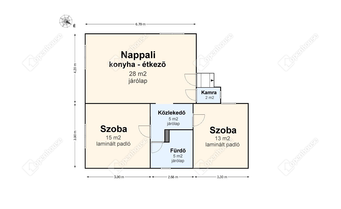 - kompakt méret, 2 szoba + amerikai konyhás, étkezős nappali alig 70 m2-en