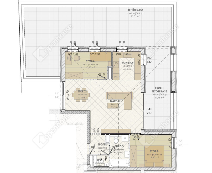 - nettó 67,34 nm lakótér, 17,78 nm fedett tetőterasz 71,01 nm tetőterasz