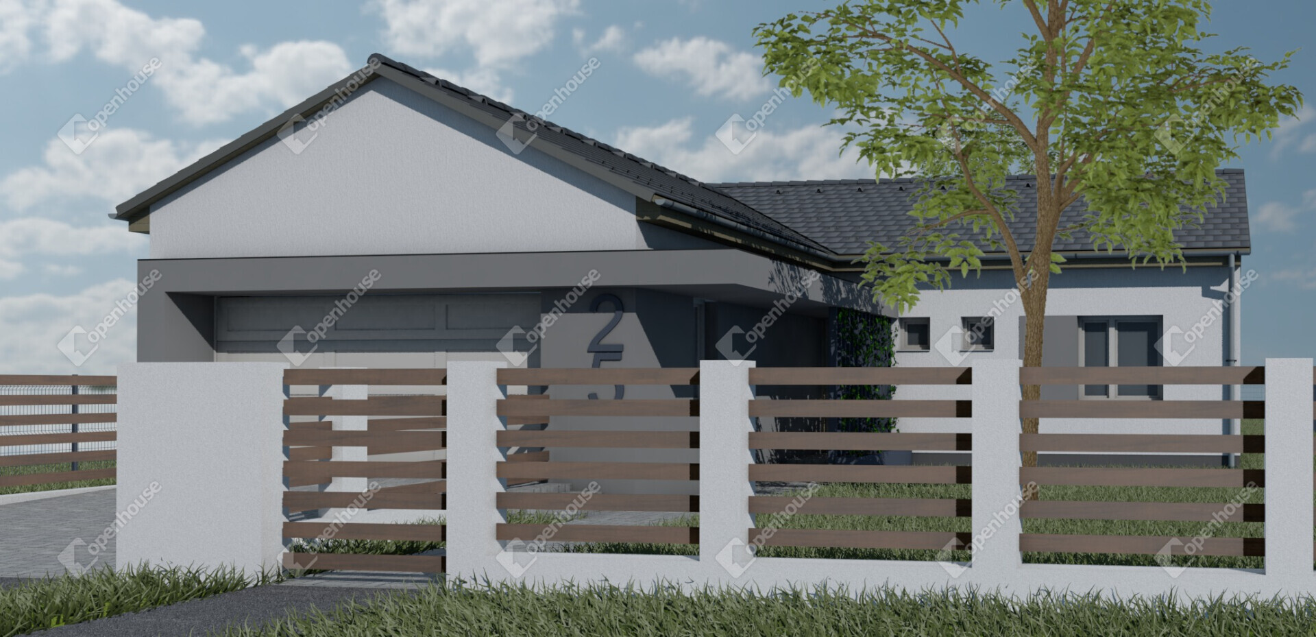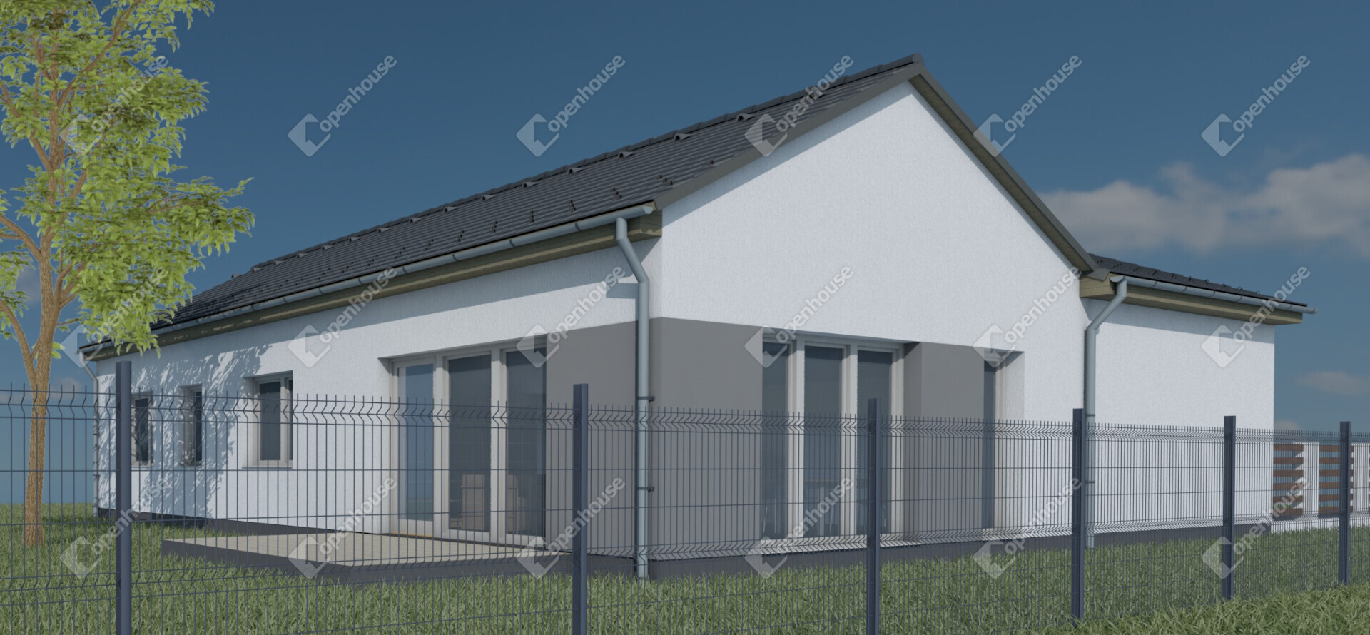 - Kerítés: Hátul és az oldalsó telekhatárokon 1,5 m magas horganyzott drótfonat készül.