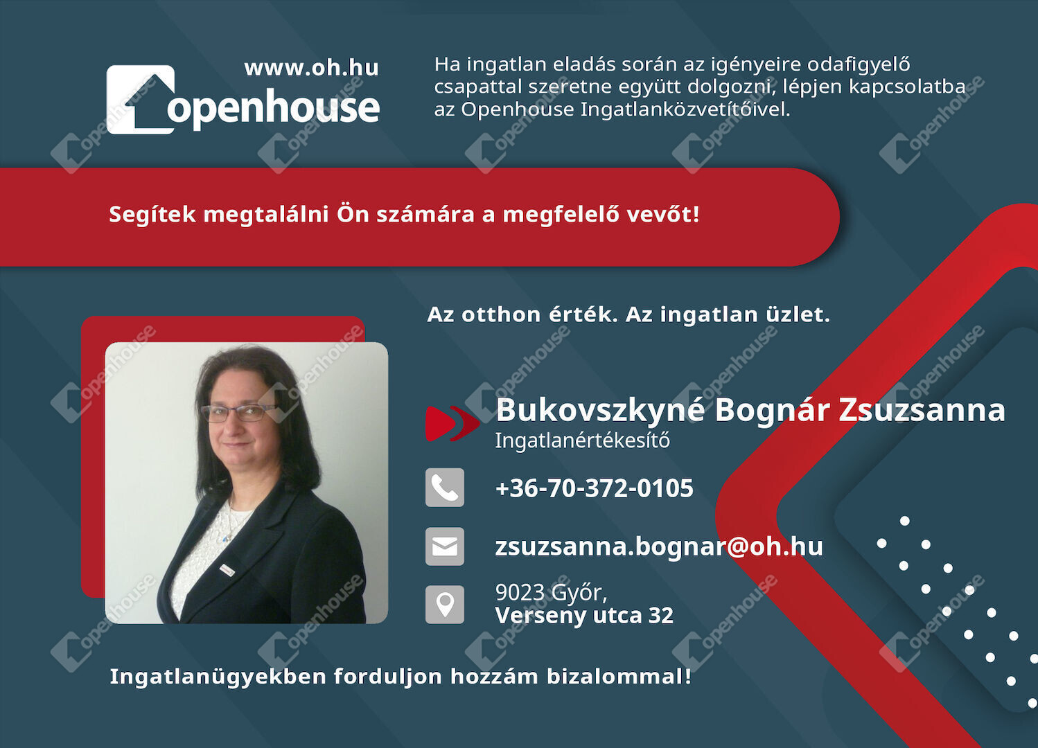 Az Openhouse Center - Győr Ingatlaniroda tagjaként várom Önt az országos hálózatunk teljes kínálatával.