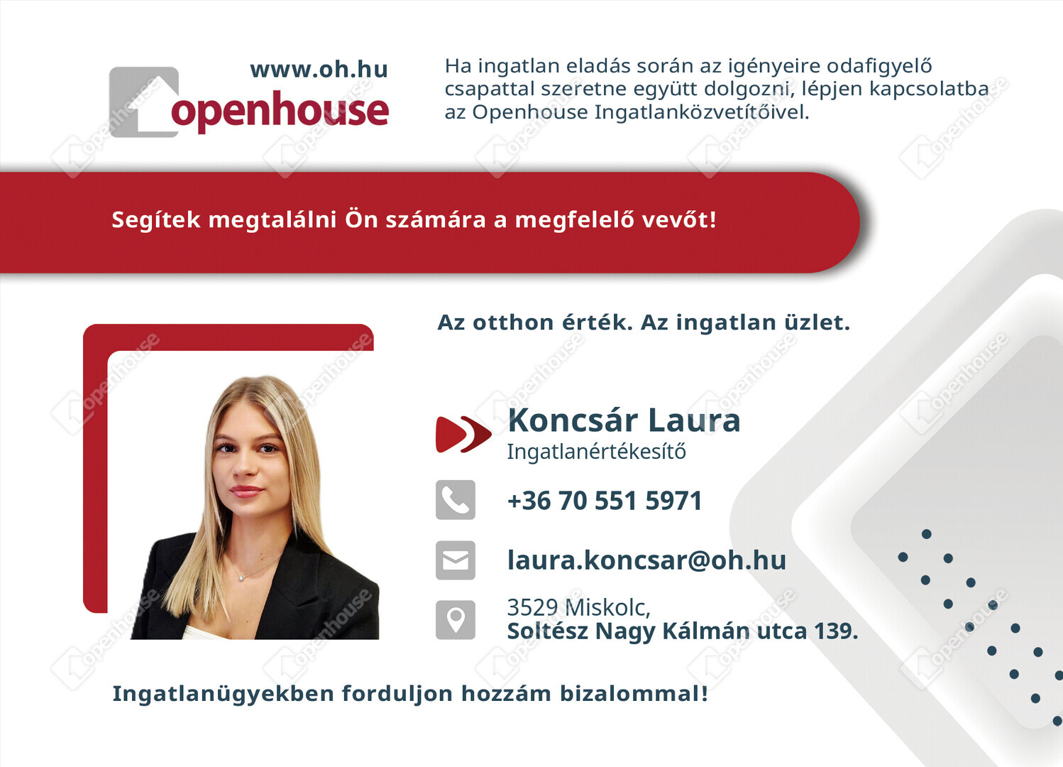 Az Openhouse Miskolc Soltész Nagy Kálmán utcai Ingatlaniroda tagjaként várom Önt az országos hálózatunk teljes kínálatával.