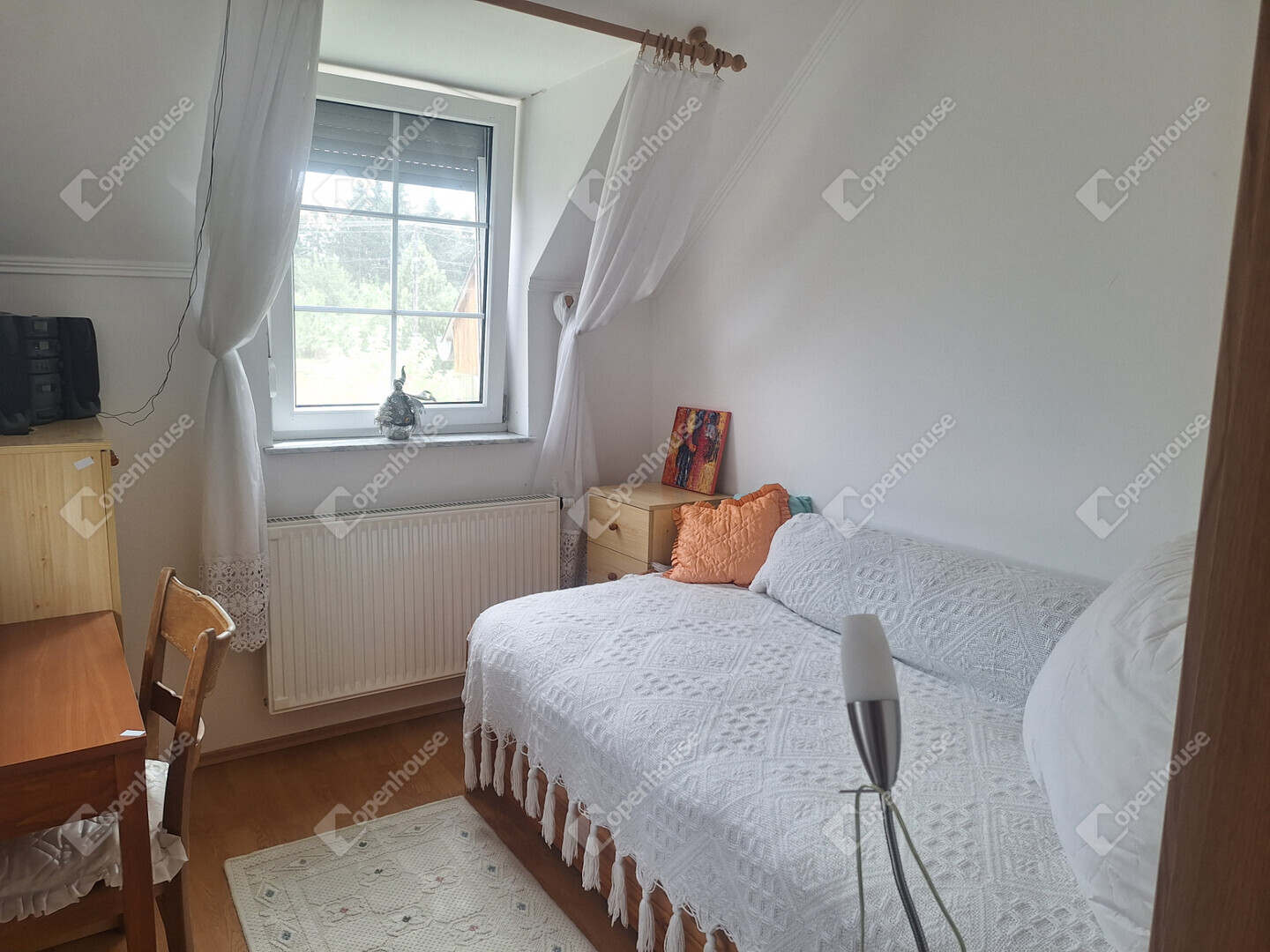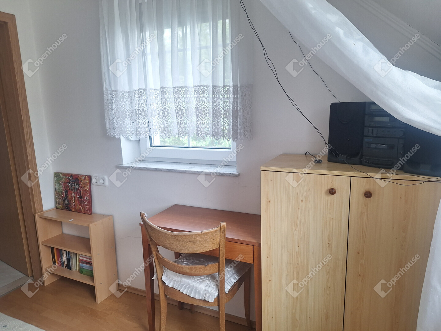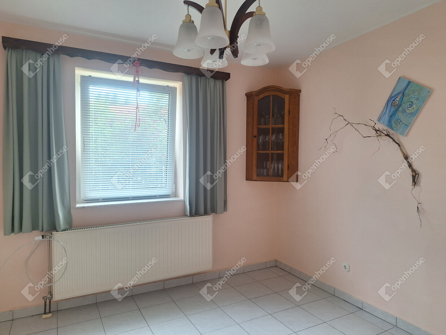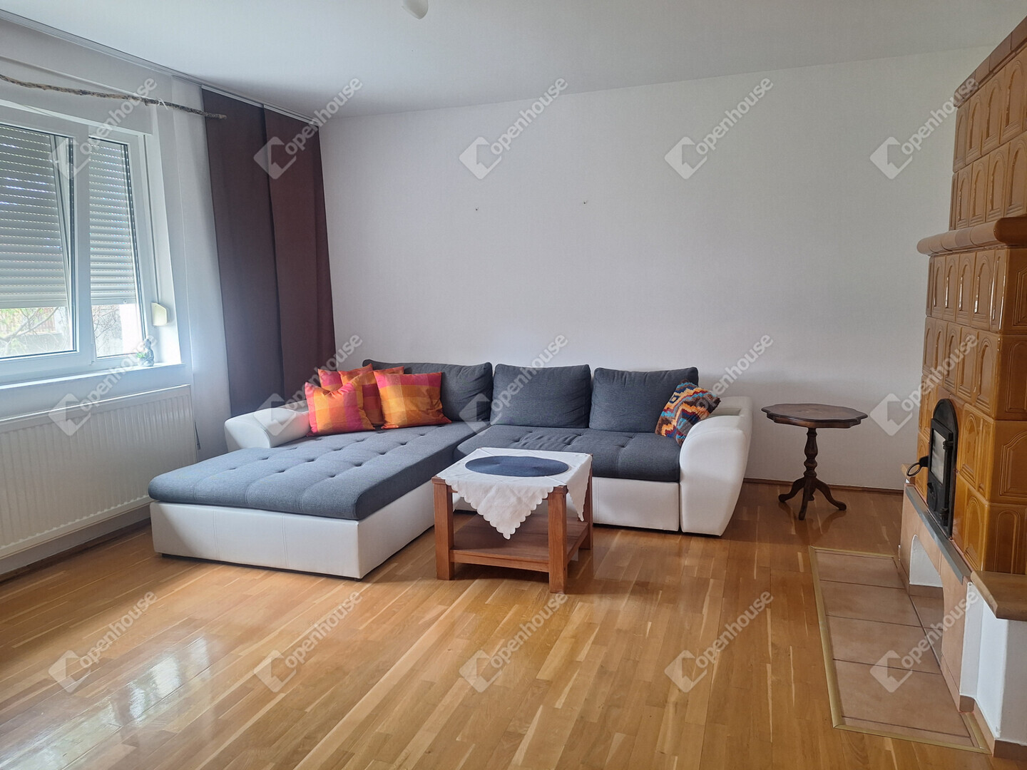 A földszinten egy napfényes, tágas nappali fogad minket, amelynek hangulatát egy gyönyörű, épített cserépkályha teszi még meghittebbé. Innen nyílik egy szintén világos hálószoba, emellett található egy kisebb szoba, valamint egy jelenleg étkezőként használt helyiség, amely igény szerint szobává is alakítható.
