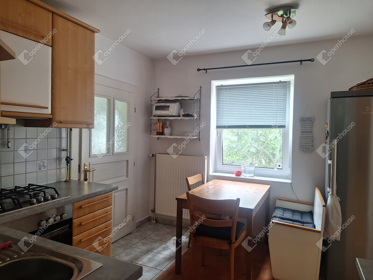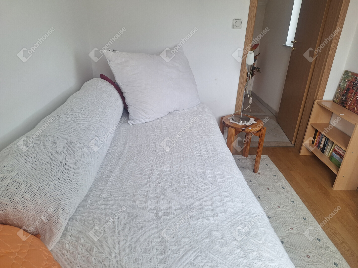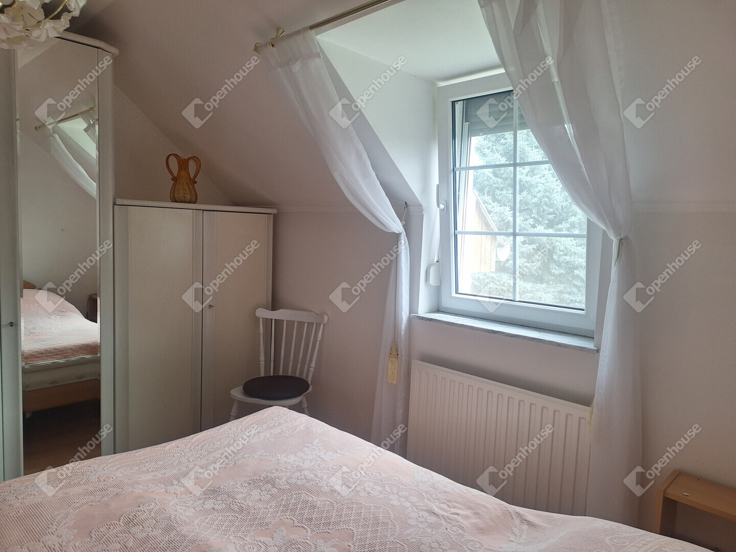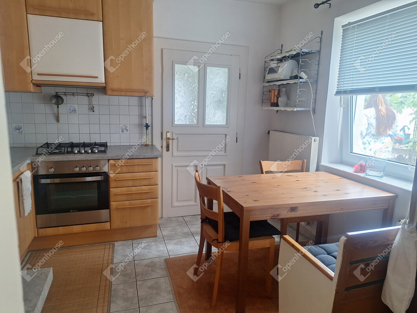A földszinten egy napfényes, tágas nappali fogad minket, amelynek hangulatát egy gyönyörű, épített cserépkályha teszi még meghittebbé. Innen nyílik egy szintén világos hálószoba, emellett található egy kisebb szoba, valamint egy jelenleg étkezőként használt helyiség, amely igény szerint szobává is alakítható.
