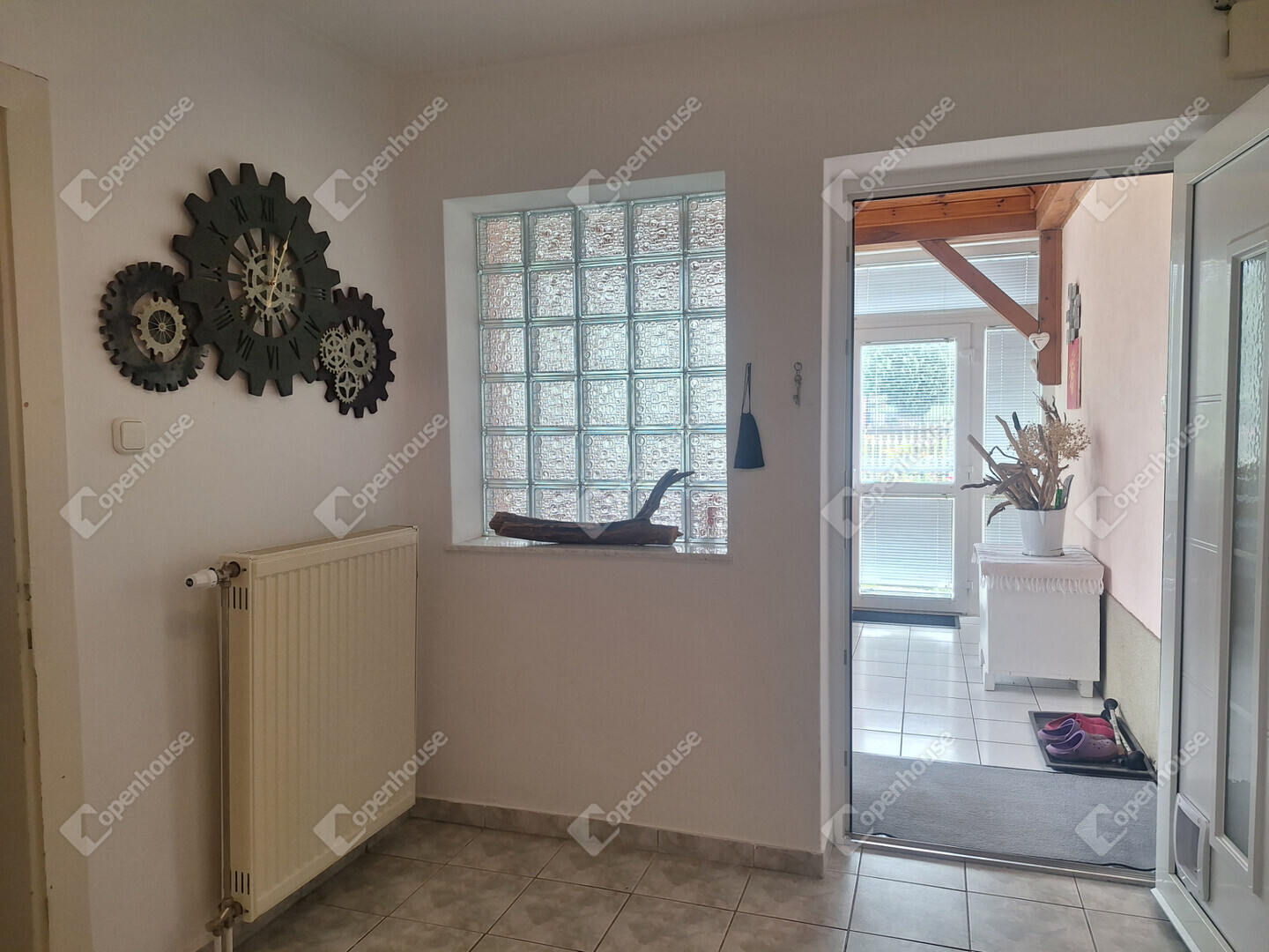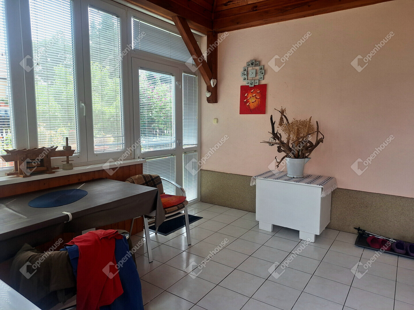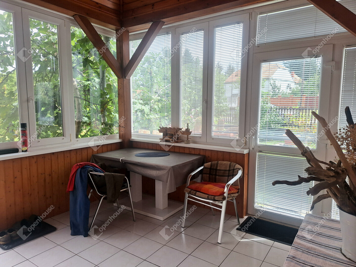 A bejárat előtt egy ablakokkal körbezárt, napfényes terasz biztosítja a reggeli kávé vagy a délutáni pihenés tökéletes helyszínét.