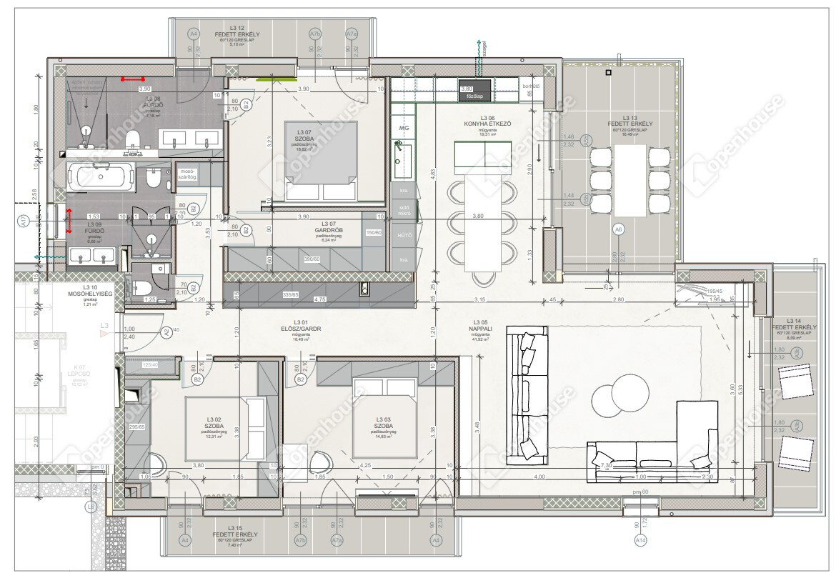 A lakás hőszivattyús hűtés-fűtés és hővisszanyerős szellőztető rendszerrel készül, amely energiatakarékos és környezetbarát megoldást biztosít. Loxone okos otthon rendszer kerül beépítésre, fokozva a kényelmet. A nagy üvegfelületek maximális természetes fényt engednek be, míg a prémium burkolatok és belsőépítészeti részletek a legmagasabb igényeket is kielégítik. A lakáshoz két garázs (30 000 000 Ft/2db) és egy tároló (12 000 000 Ft) is tartozik mely igény szerint megvásárolható.