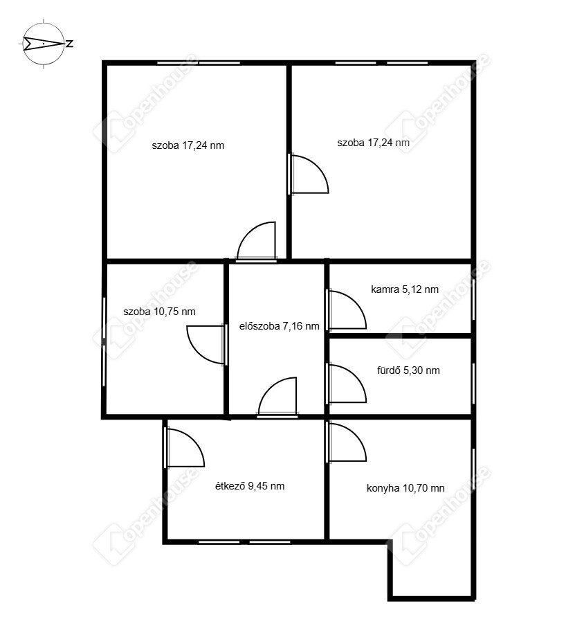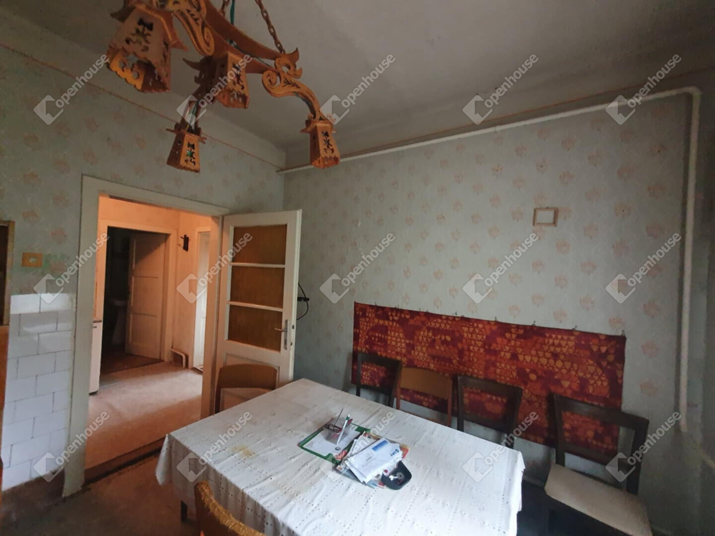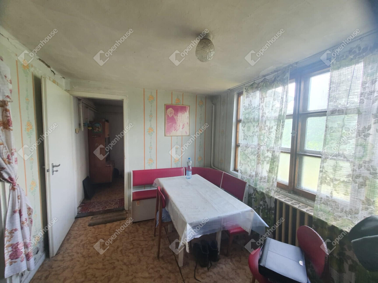 A ház elosztása praktikus: három szoba (17,24 – 17,24 – 10,75 m²), étkező (9,45 m²), konyha (10,70 m²), fürdő, kamra, előszoba. A fűtés fatüzelésű kazánnal megoldott.