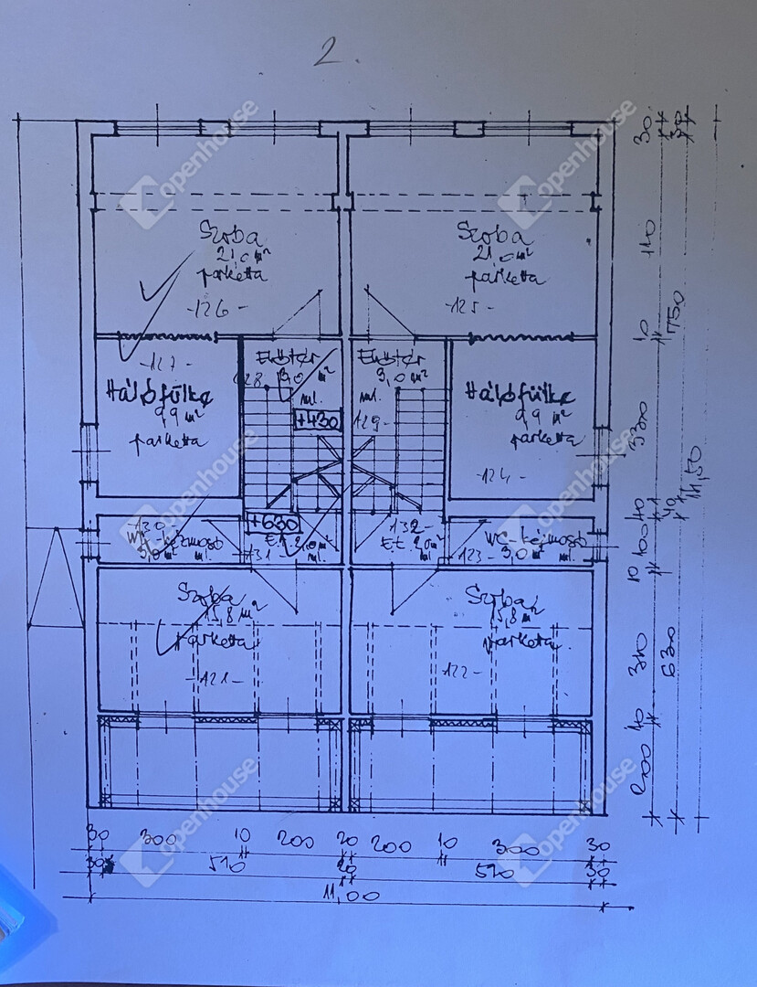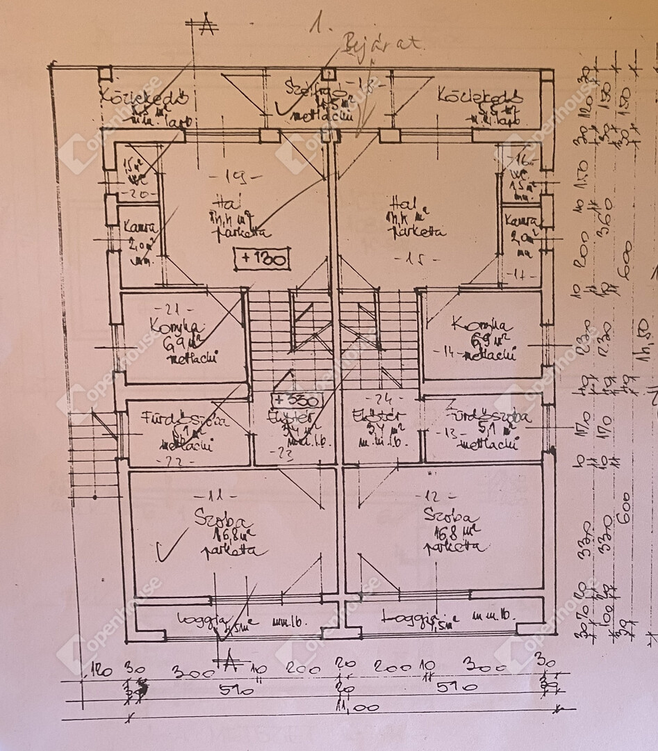 - lakásonként 4 szoba, konyha, kamra, fürdőszoba, 2 mellékhelyiség kézmosóval, erkéllyel, fedett előtérrel