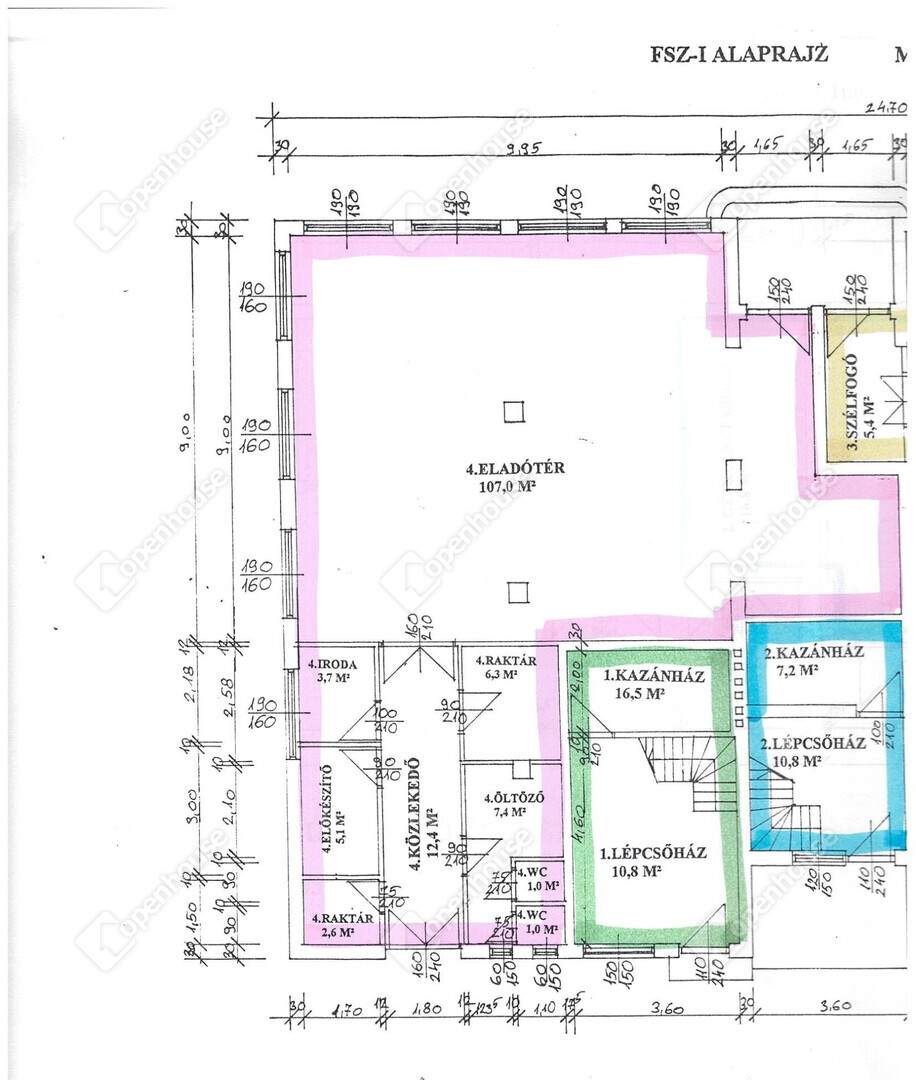 Belső tere 107 m²-es eladótérből áll, ehhez kapcsolódik előkészítő-konyha, 2db raktár, öltöző és 2 db wc.