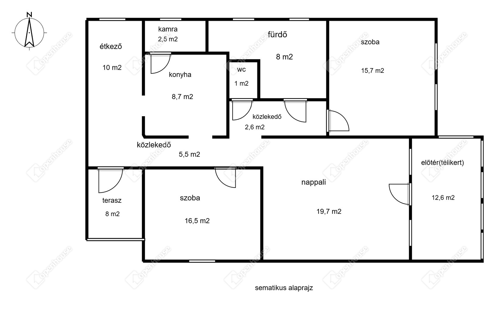 103 m²-es lakótér, átgondolt és praktikus elosztással: nappali + 2 szoba, konyha, előszoba, kamra, fürdőszoba, külön WC, valamint egy napfényes télikert, amely egész évben otthonos hangulatot áraszt