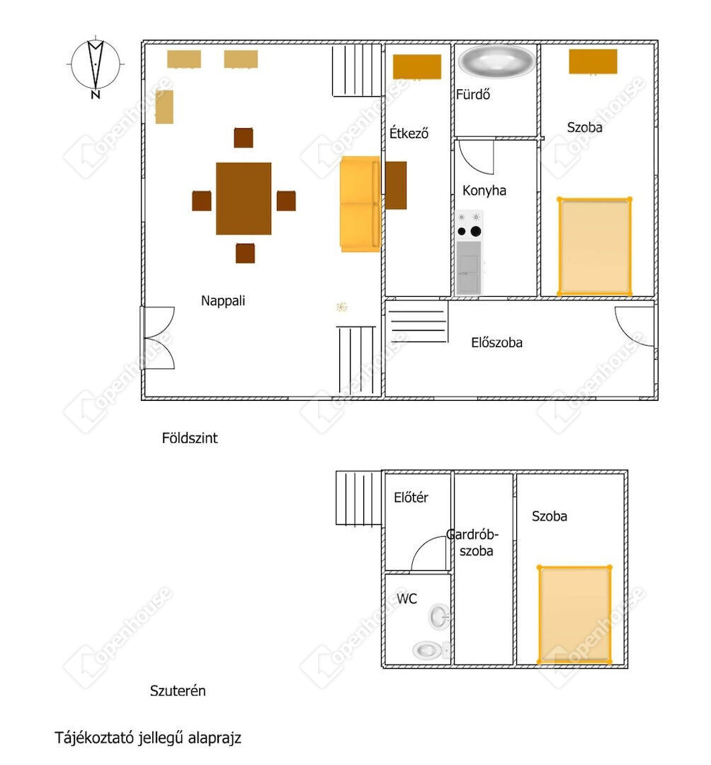 Földszint: nappali, előszoba, konyha, fürdőszoba