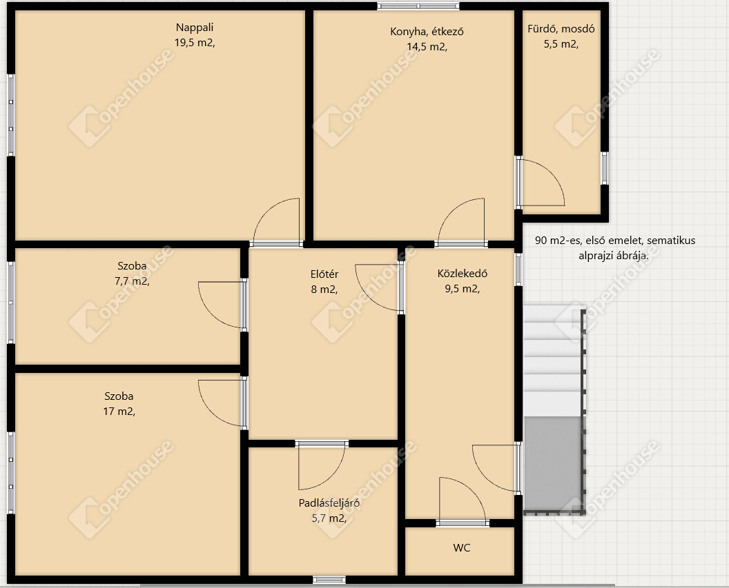 - földszint felett, az első emeleten kapott helyet a lakórész, ahová egy külső lépcsőn lehet feljutni, majd egy belső, zárt lépcsőház vezet tovább