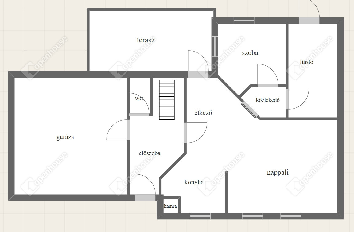- Földszinten található egy tágas előszoba, nappali, konyha, kamra, étkező, 1 hálószoba és egy fürdőszoba + WC