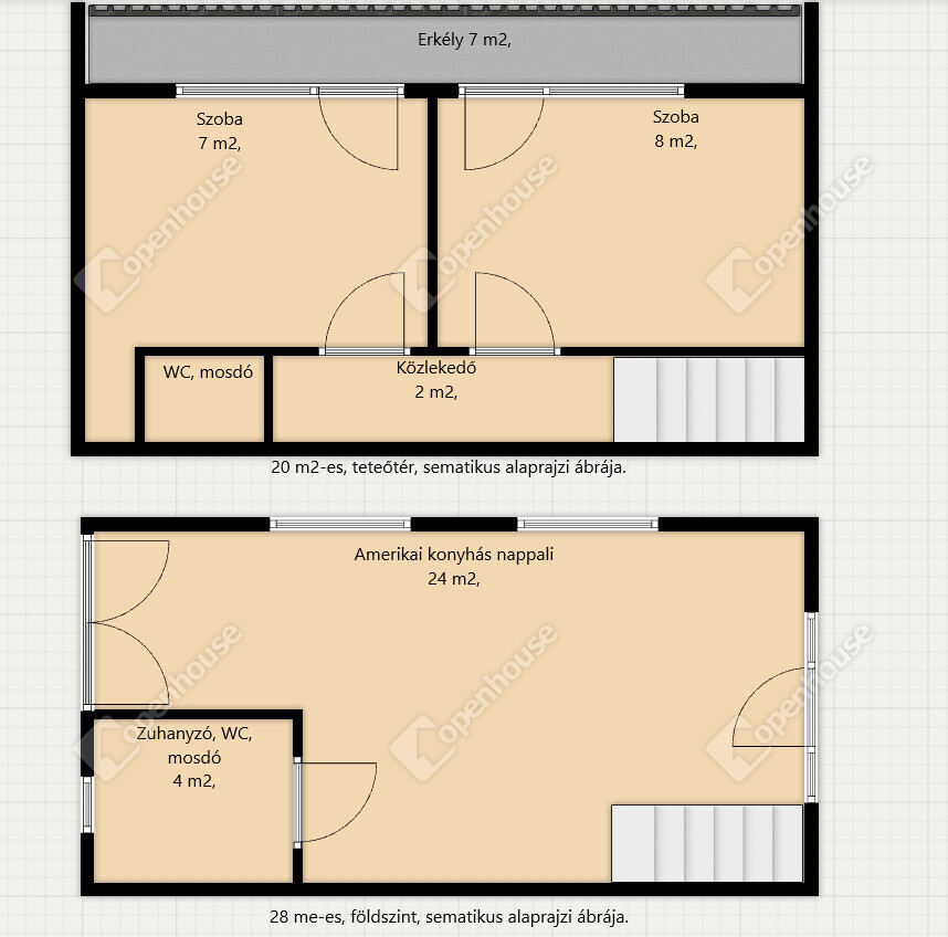- a felső szinten egy 7 m2-es, a két szoba számára közös erkély található