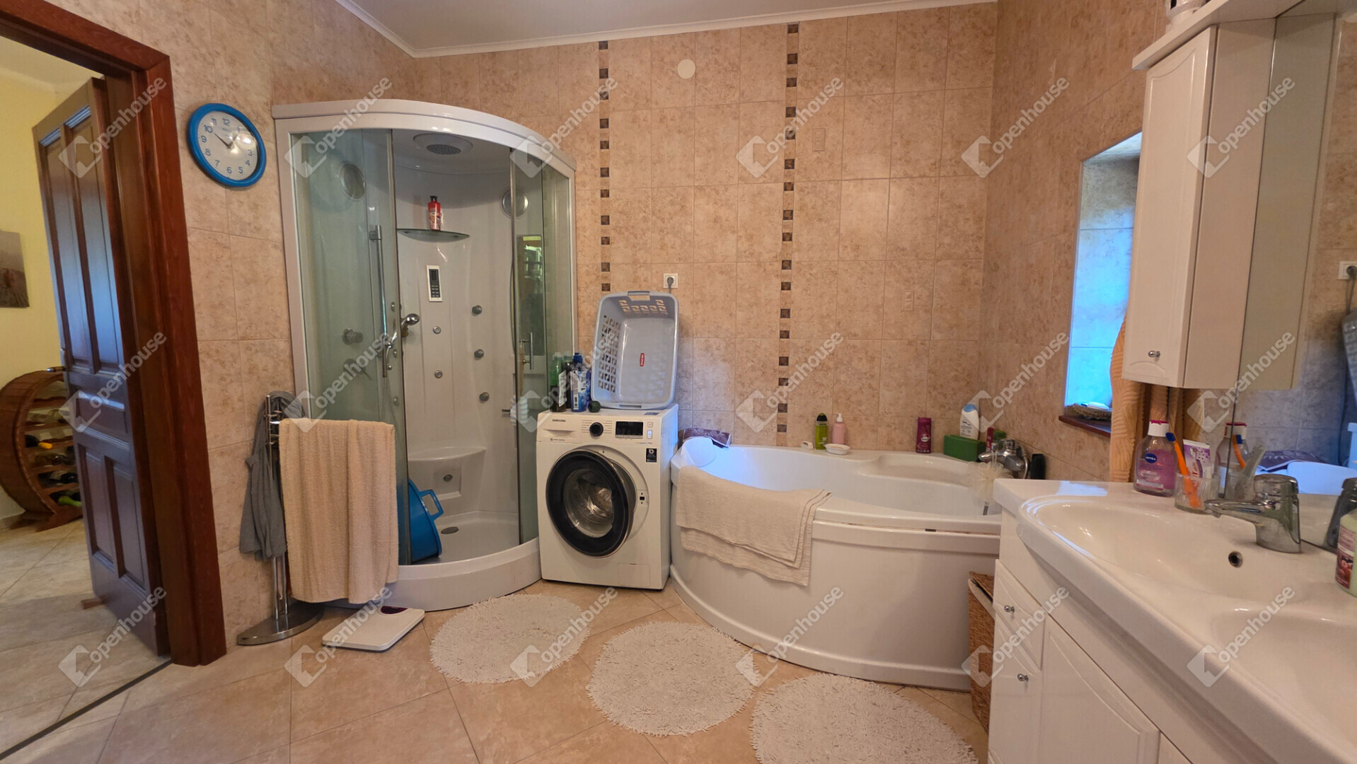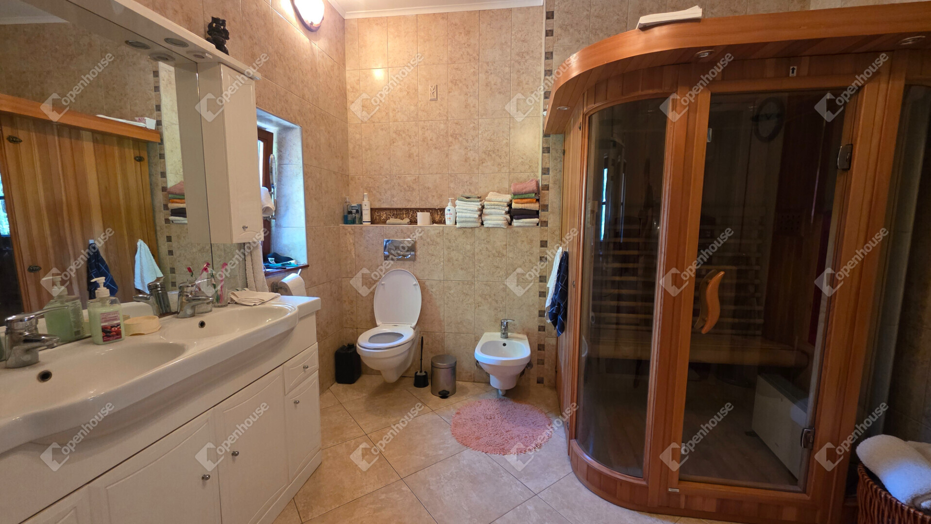 - a földszinten egy 124 m2-es lakás konyhával, étkezővel, nappalival, hálószobával, dolgozóval, nagy méretű fürdőszobával, ahol egy infra szauna is üzemel