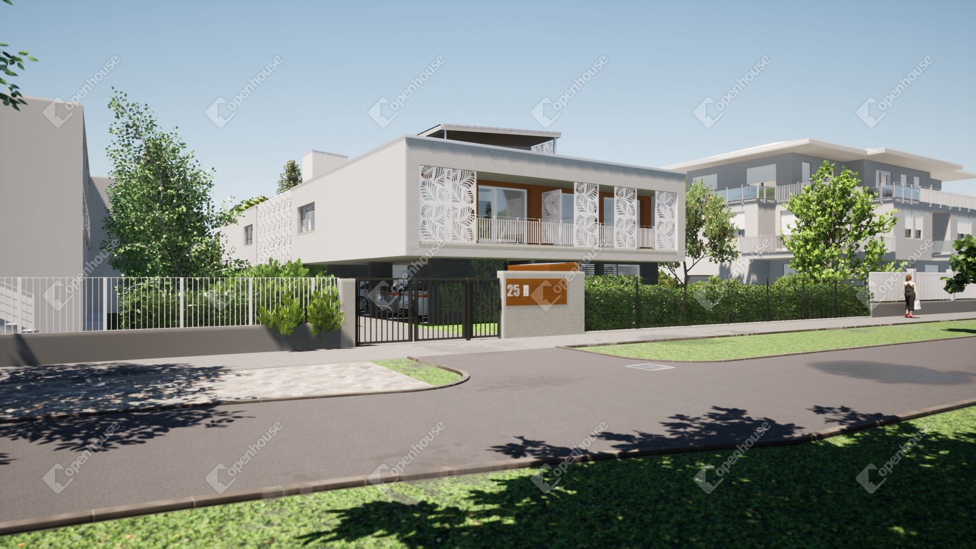 A társasház kertje parkosított, automata öntözőrendszerrel kiépített zöld területekkel.