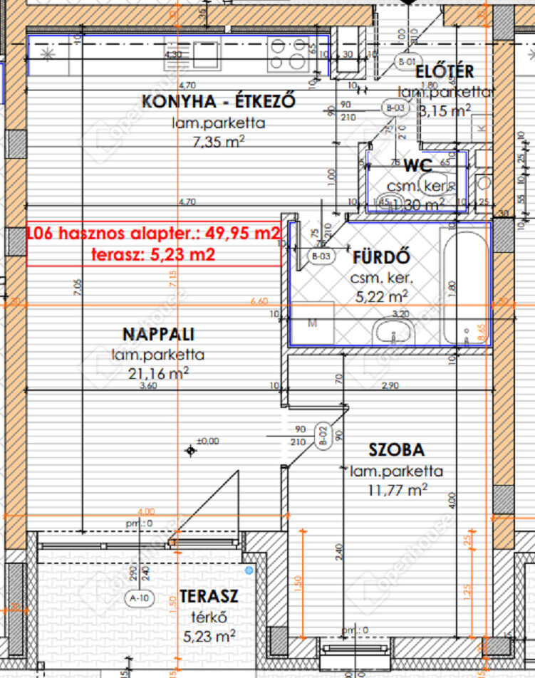 - nettó 49,95 m2-es lakás + 5,23 m2-es fedett terasz
