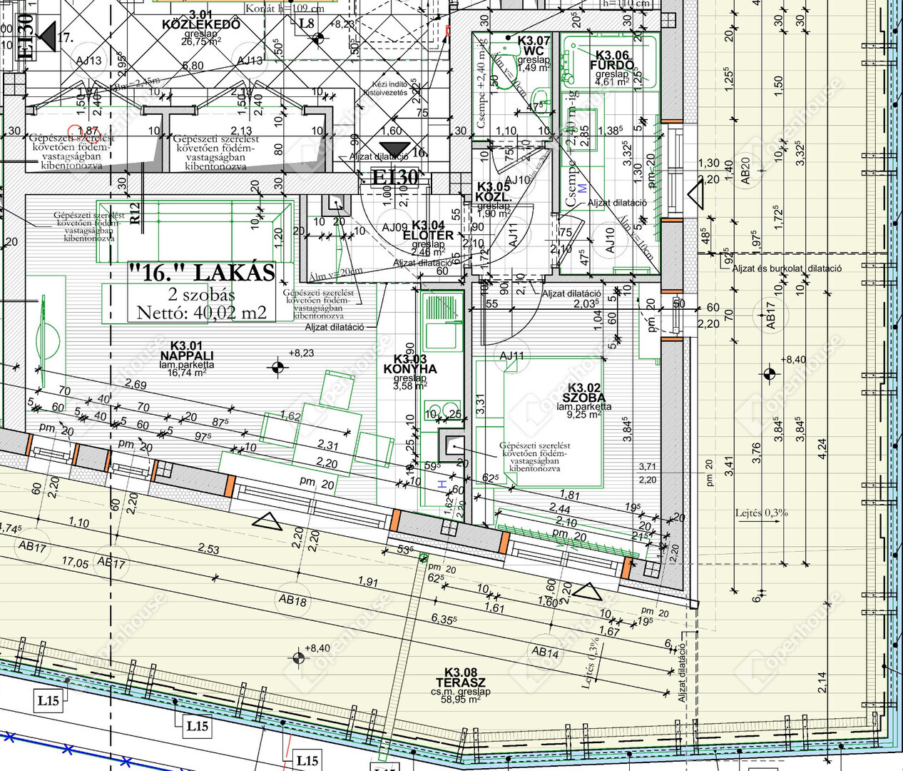 3. emeleti 16-os lakás 40.02 m2 alapterületű 55.05 m2-es terasszal.