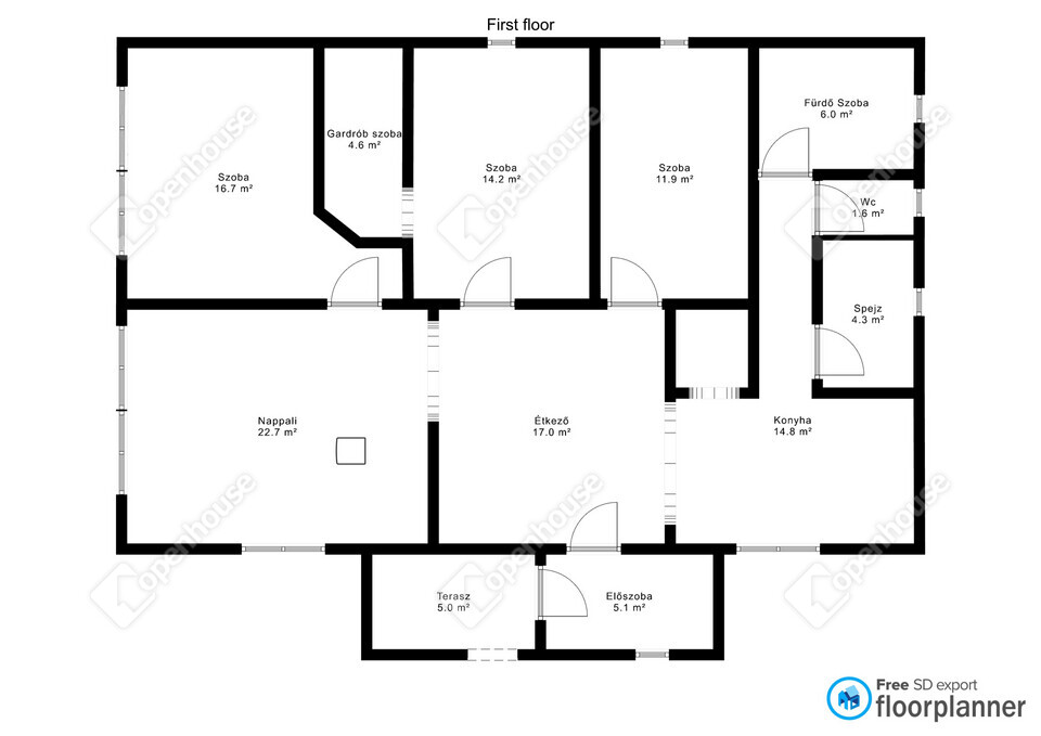 • Nappali + 3 külön nyíló szoba