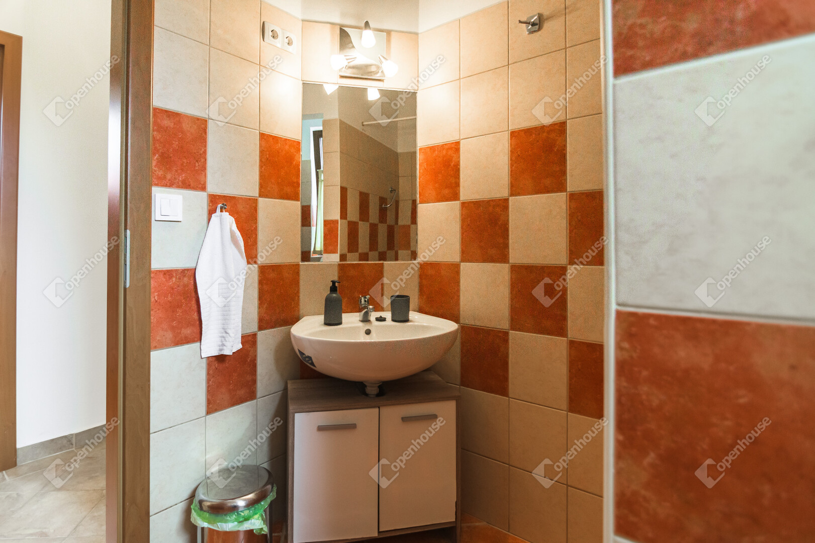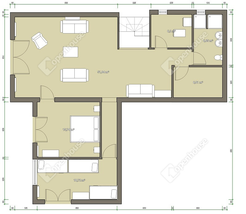 Alsó szint: nappali, 2 hálószoba, fürdő, tároló, kazánház.