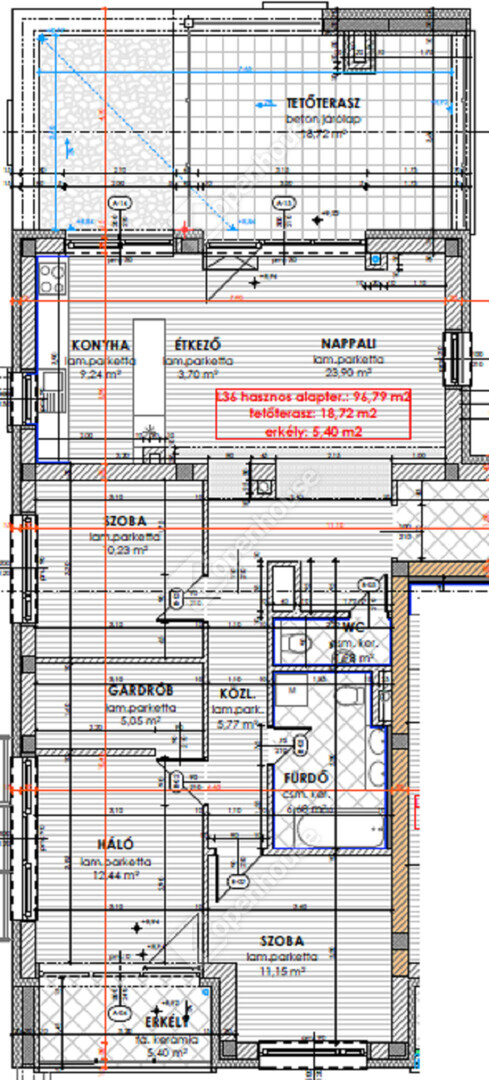 - nettó 96,12 m2-es lakás + 5,6 m2-es fedett erkély +18,72 fedett tetőterasz
