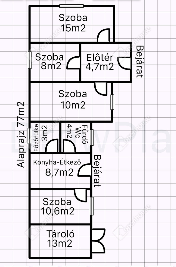 -Helyiségek 77m2 alapterületen: négy szoba, konyha-étkező, fürdő-wc, előtér, főzőfülke, tároló.