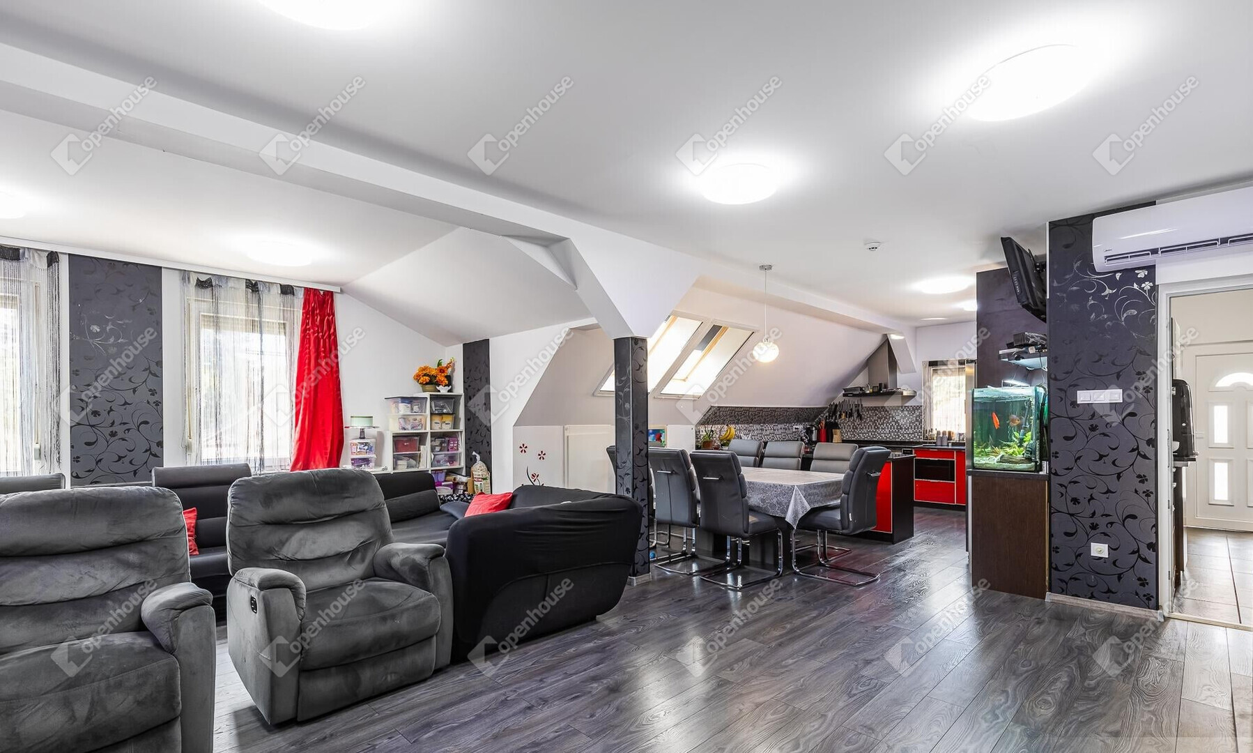 A tetőtér 180cm feletti alapterülete 130nm, mely 2db lakásból áll, de ezek igény szerint összenyithatóak. Az egyik 25nm, melyben található 1 szoba és egy fürdőszoba káddal. A másikban 3 hálószoba, kádas fürdőszoba, hozzá egy hatalmas amerikaikonyhás étkezős-nappali. Jelenleg egy háztartásban van a két lakás. MINDEN háló és a nappali is, INVERTERES hűtő-fűtő klímával van ellátva.