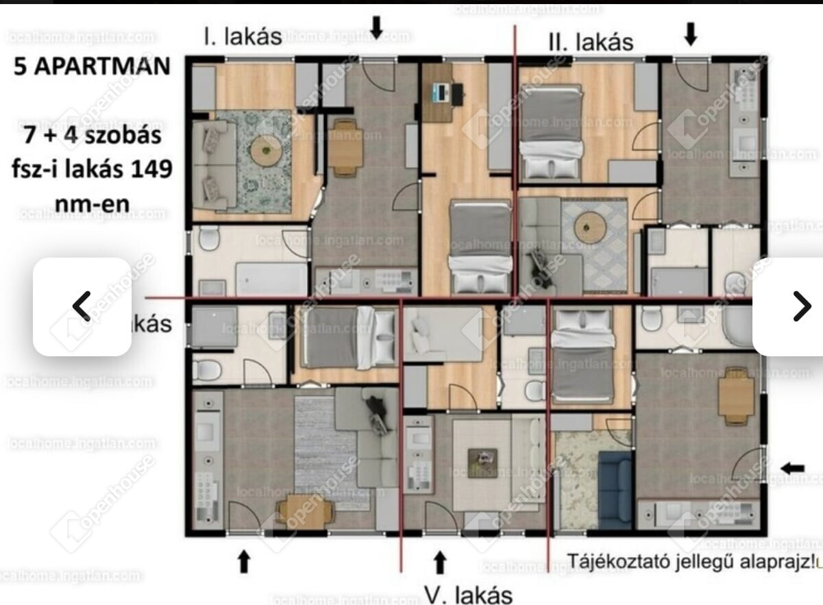 A földszinti lakások összessége148nm, ennek egy részében kapott helyet a 20nm-es kazánház, (mely szintén saját WC-vel, zuhannyal és kis konyával van ellátva, így szabadon használható akár vendégháznak is, ha egy rokon/barát maradna pár éjszakára) Ezen kívül még 4 db 1- 2-3 hálószobás kisebb lakrész lett az alsó szinten kialakítva. Mindegyik lakrész zuhanyzós fürdővel, WC-vel, konyhával/amerikaikonyhával, INVERTERES hűtő-fűtő klímával, vannak ellátva. A konyhák és a fürdők teljes gépesítéssel ellátottak!! Mindegyik lakrész külön bejárattal, saját almérőkkel és privát kis térkövezett udvarral rendelkezik. A biztonságról riasztóberendezés kivonuló szolgálattal és kamerarendszer gondoskodik!