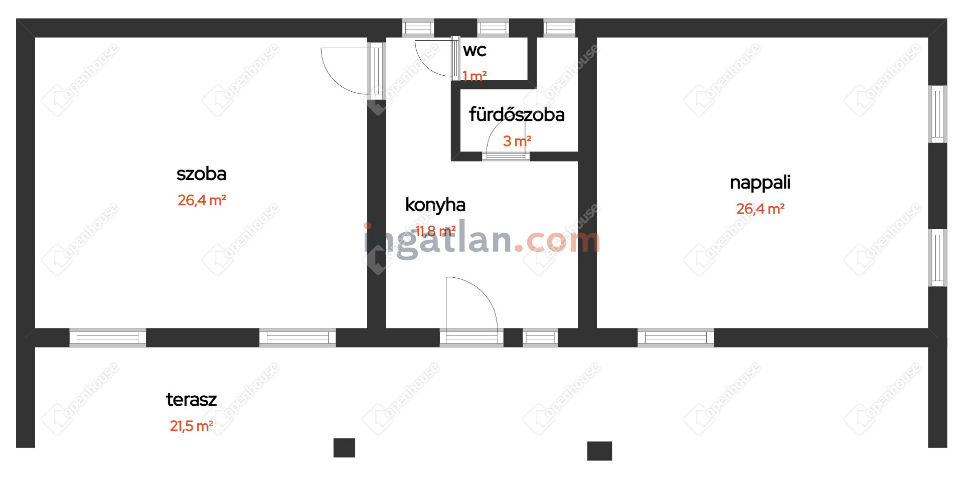 | Szoba | 26.40 m2 | Burkolat nélküli |