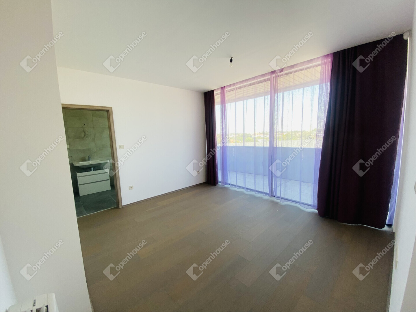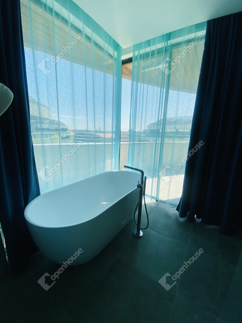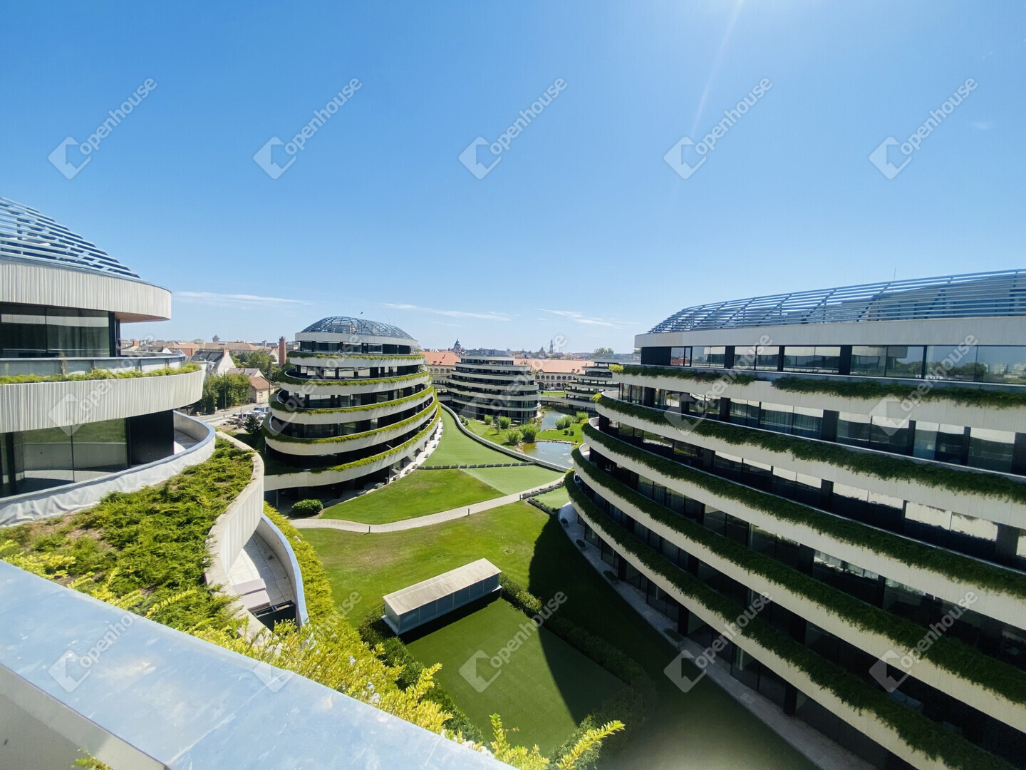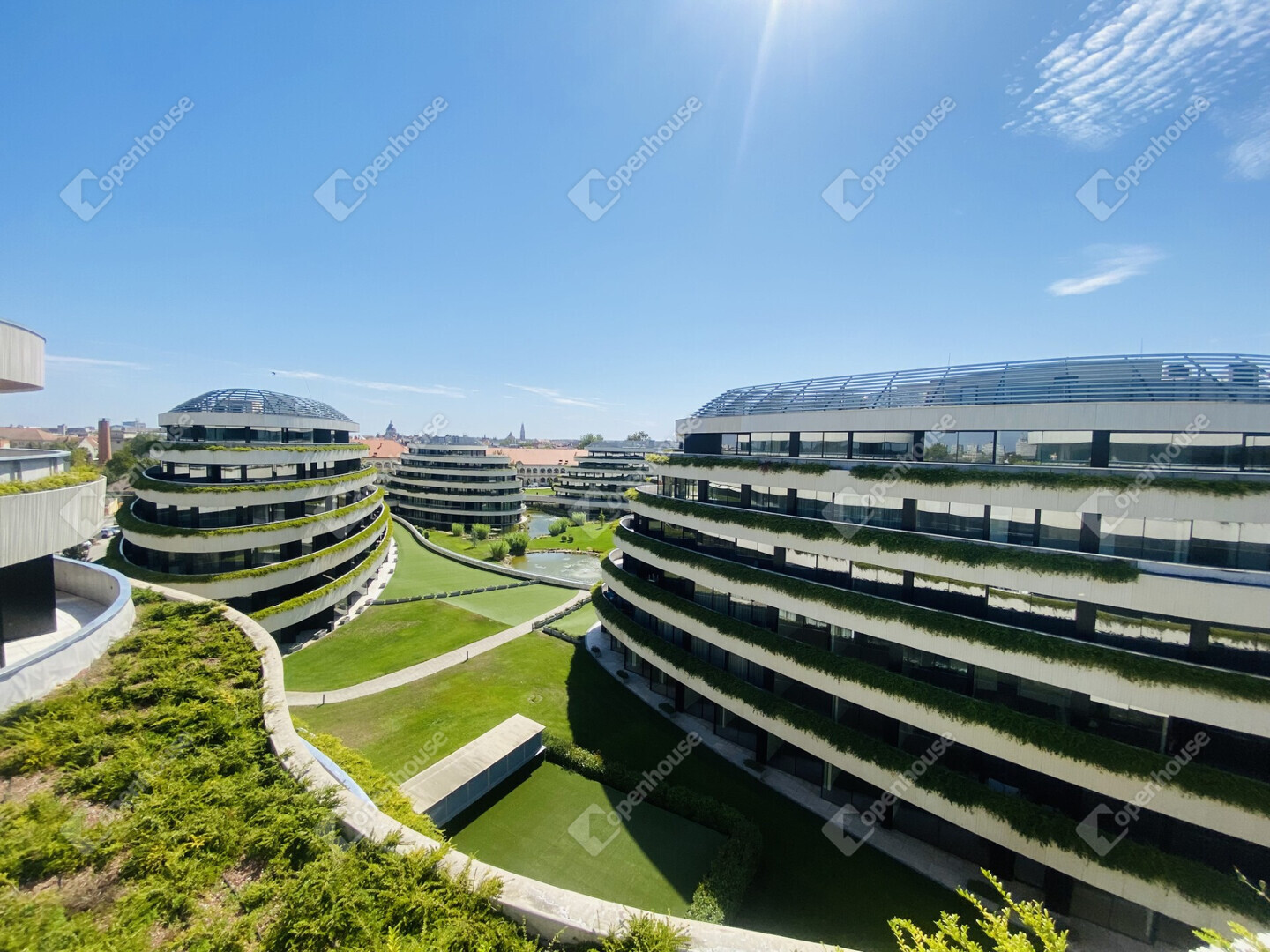 Eladó egy 106 m²-es, exkluzív 5. emeleti lakás, hatalmas 52,5 m² terasszal, ahonnan lélegzetelállító panoráma nyílik a városra és a lakópark saját tavára.