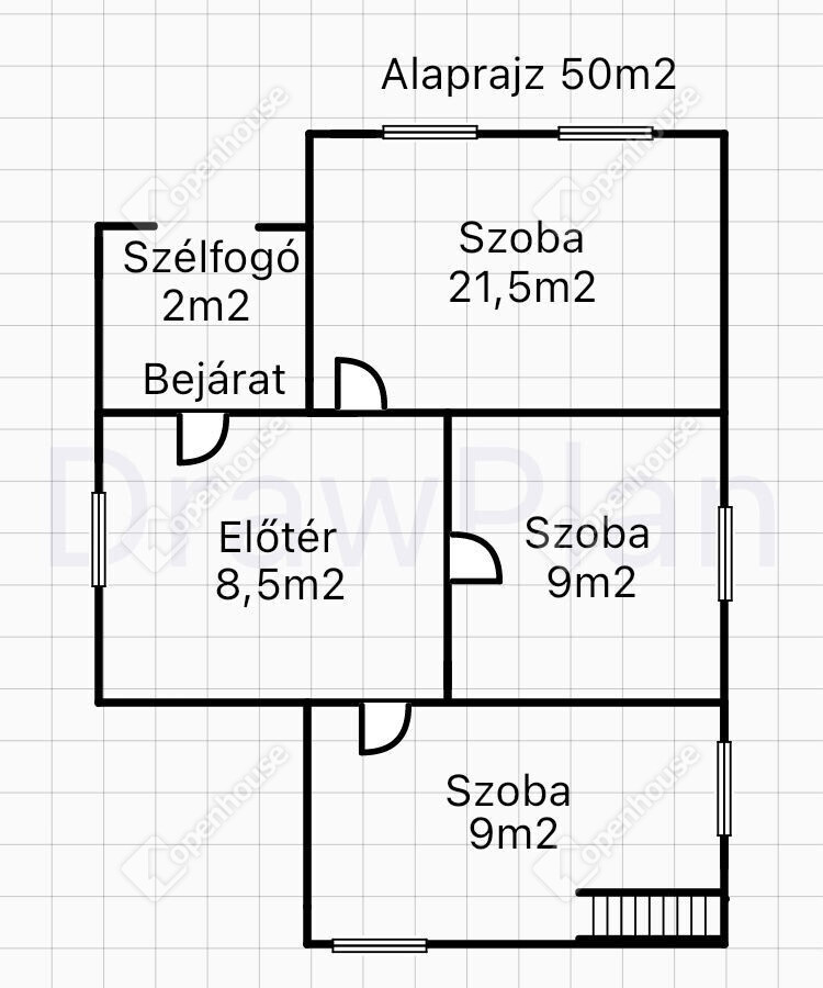 -Helyiségek 50m2 alapterületen : három szoba, előtér szélfogó. Telek területe: 793m2.
