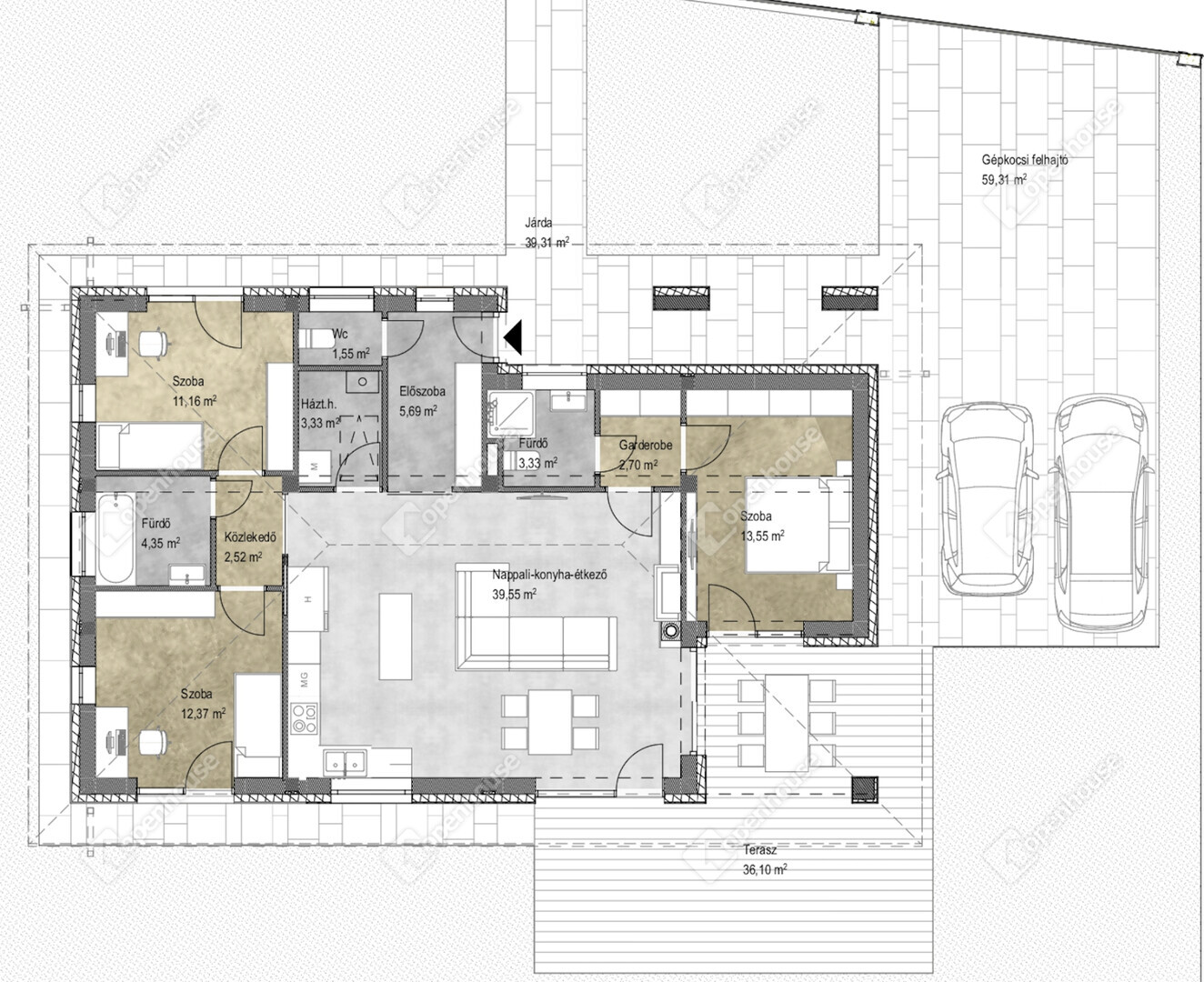 - 102m2-es családi ház + 10m2-es fedett terasz + 10m2 fedetlen terasz