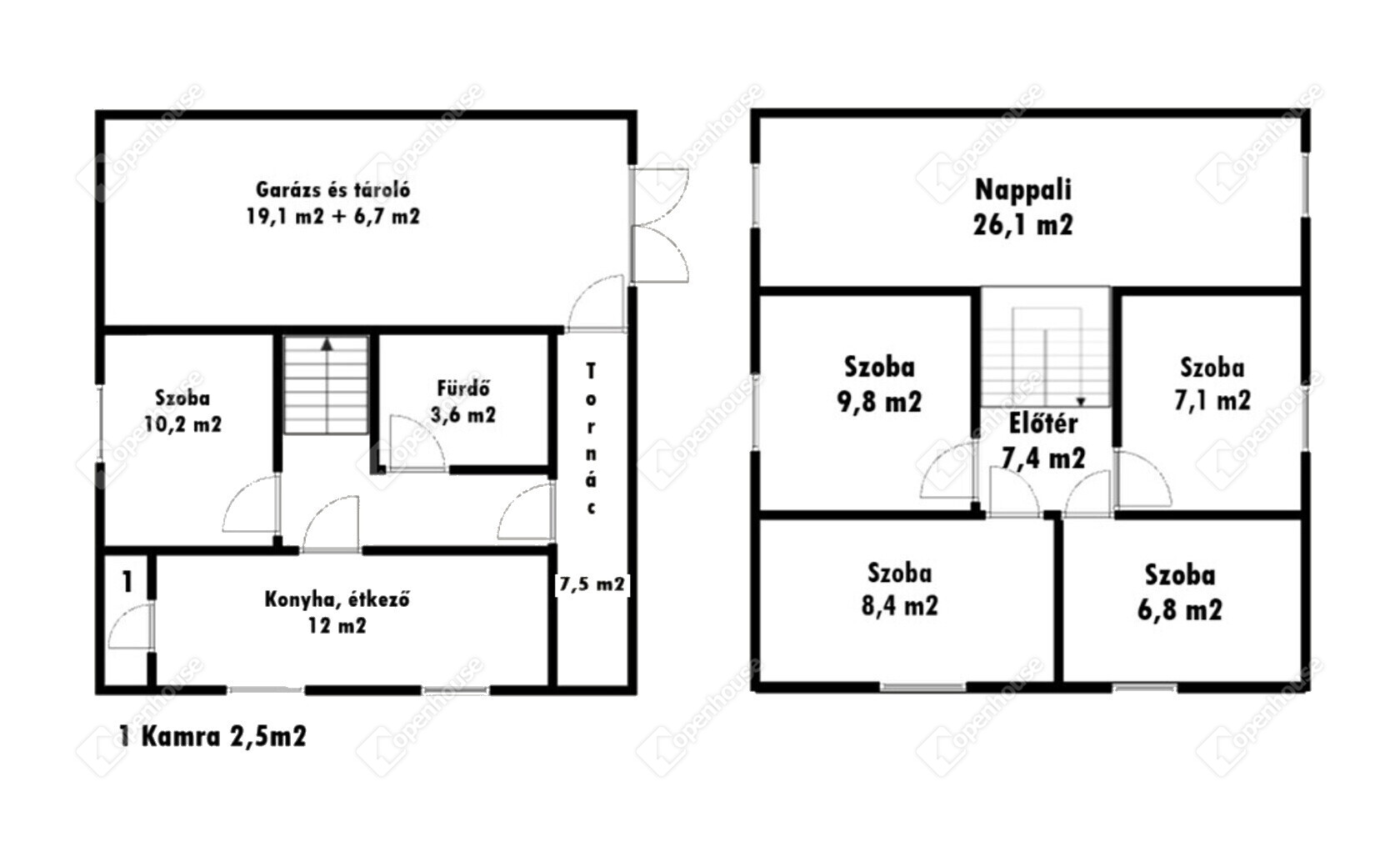 - a földszinten a bejárat, illetve egy hálószoba, konyha, kamra, WC, előszoba, közlekedő