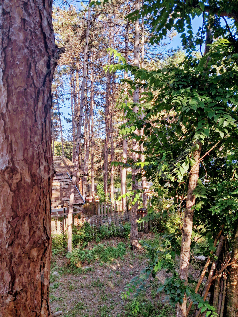 A terasz előtti fenyőfákon mókusok ugrálnak