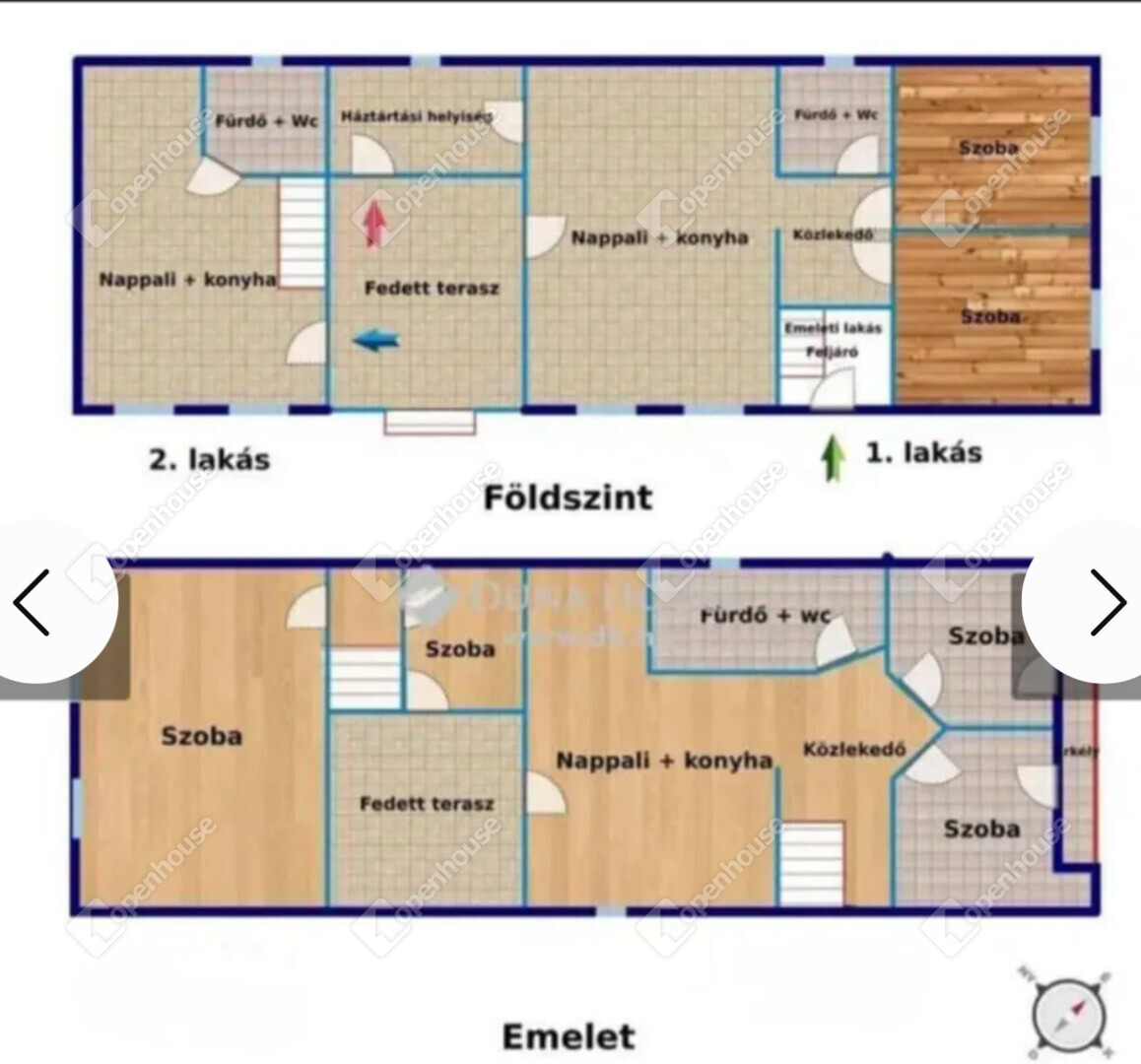 A második lakrész teljesen földszinti, szintén amerikai konyhás nappalival, két nagy szobával és közös fedett terasszal.