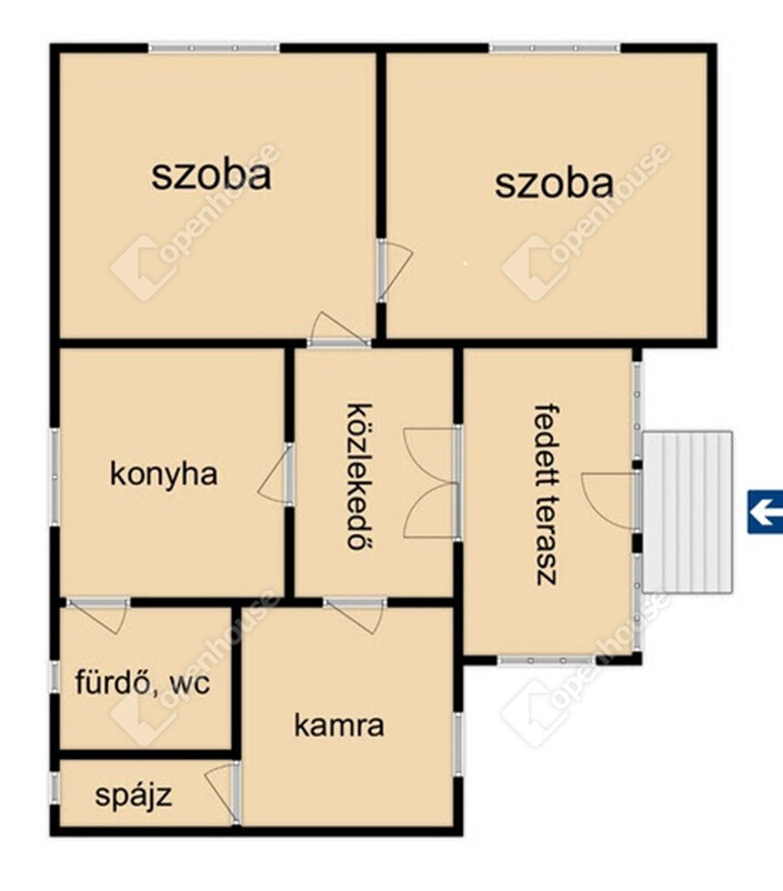 2 tágas szoba, konyha, fürdőszoba, egyben a wc-vel, spájz, kamra, kis közlekedő és egy fedett előtér áll rendelkezésre.