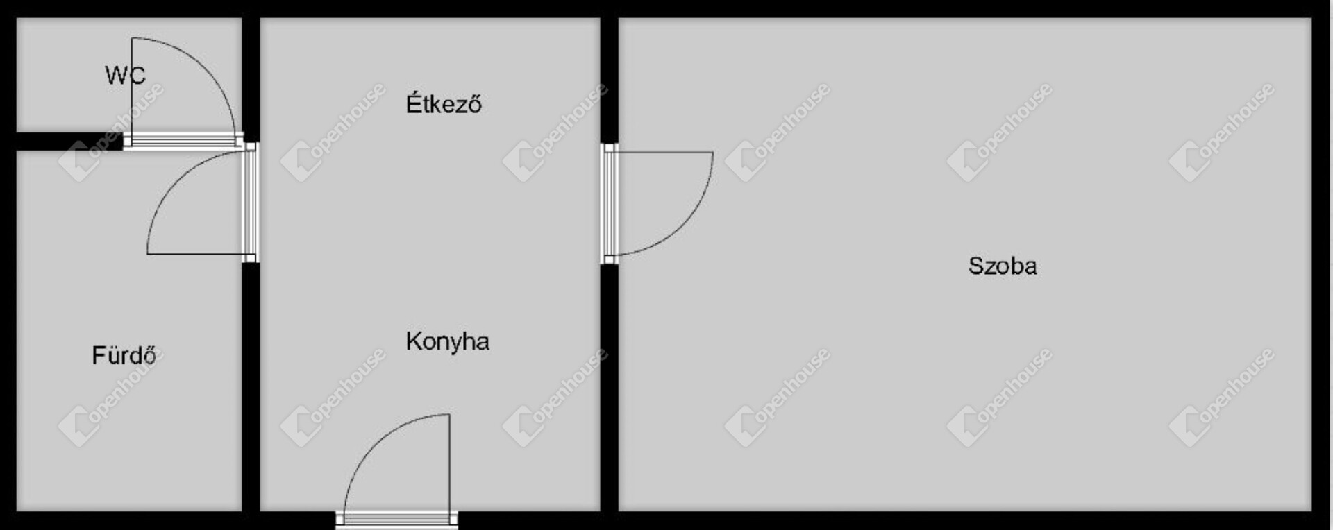 Elrendezését tekintve 1 nagy szoba, konyha, étkező, fürdő, wc.