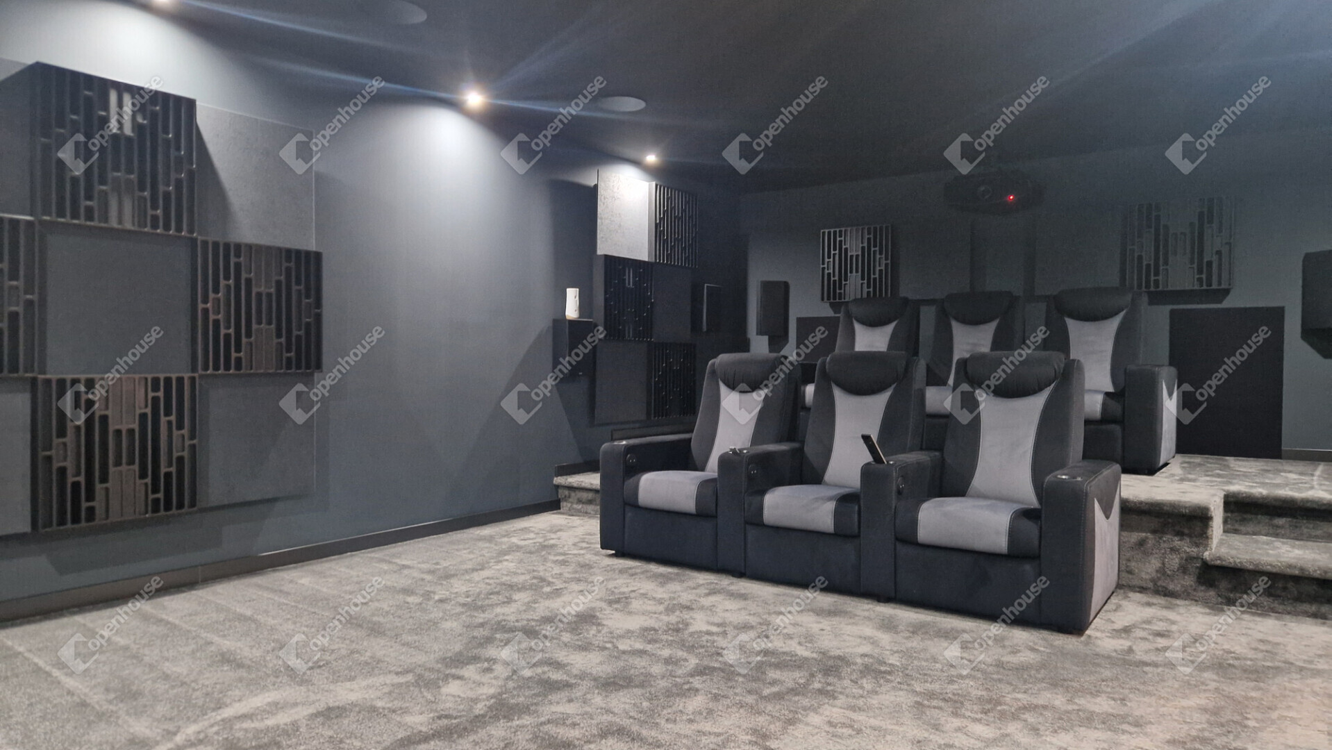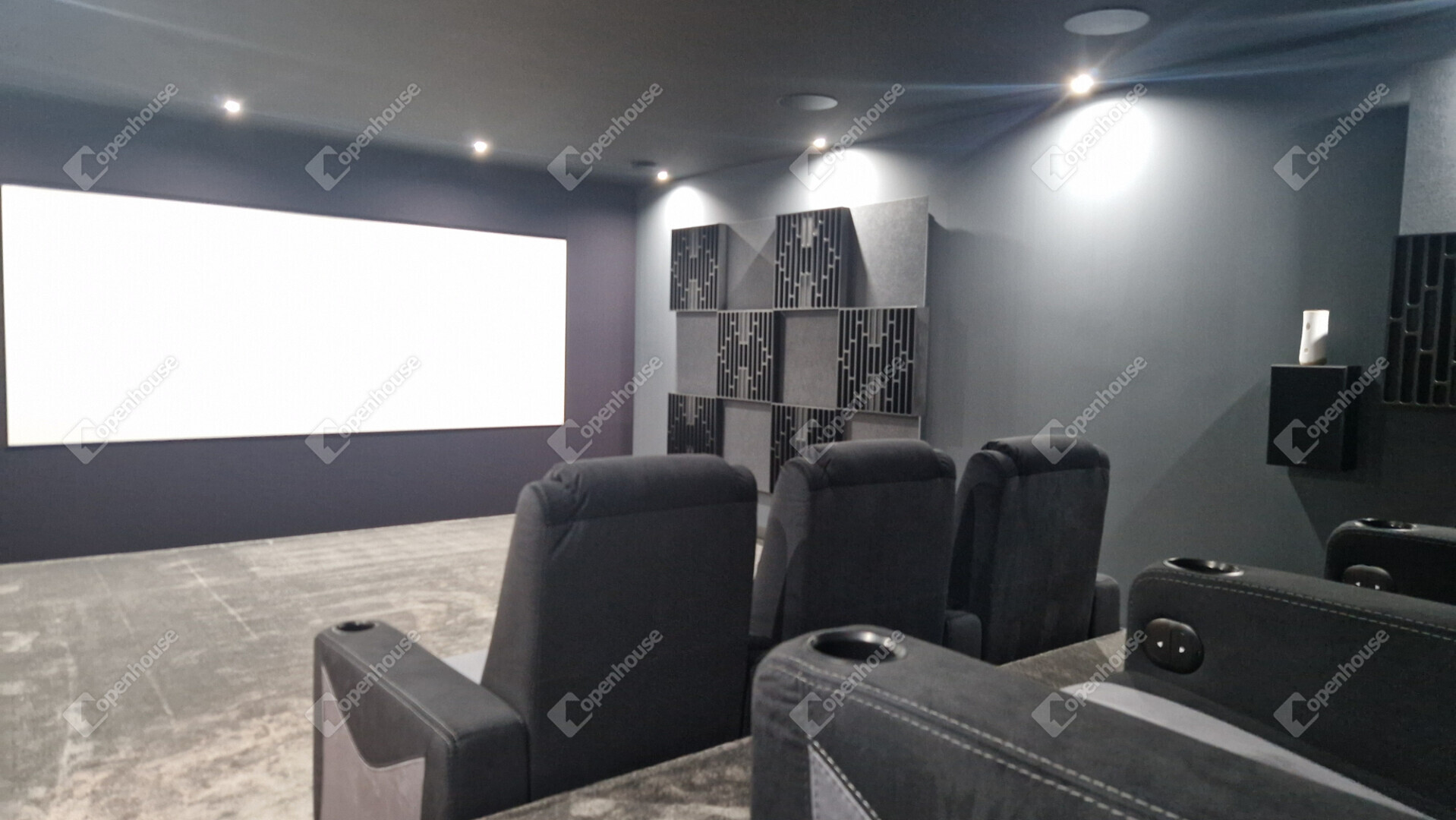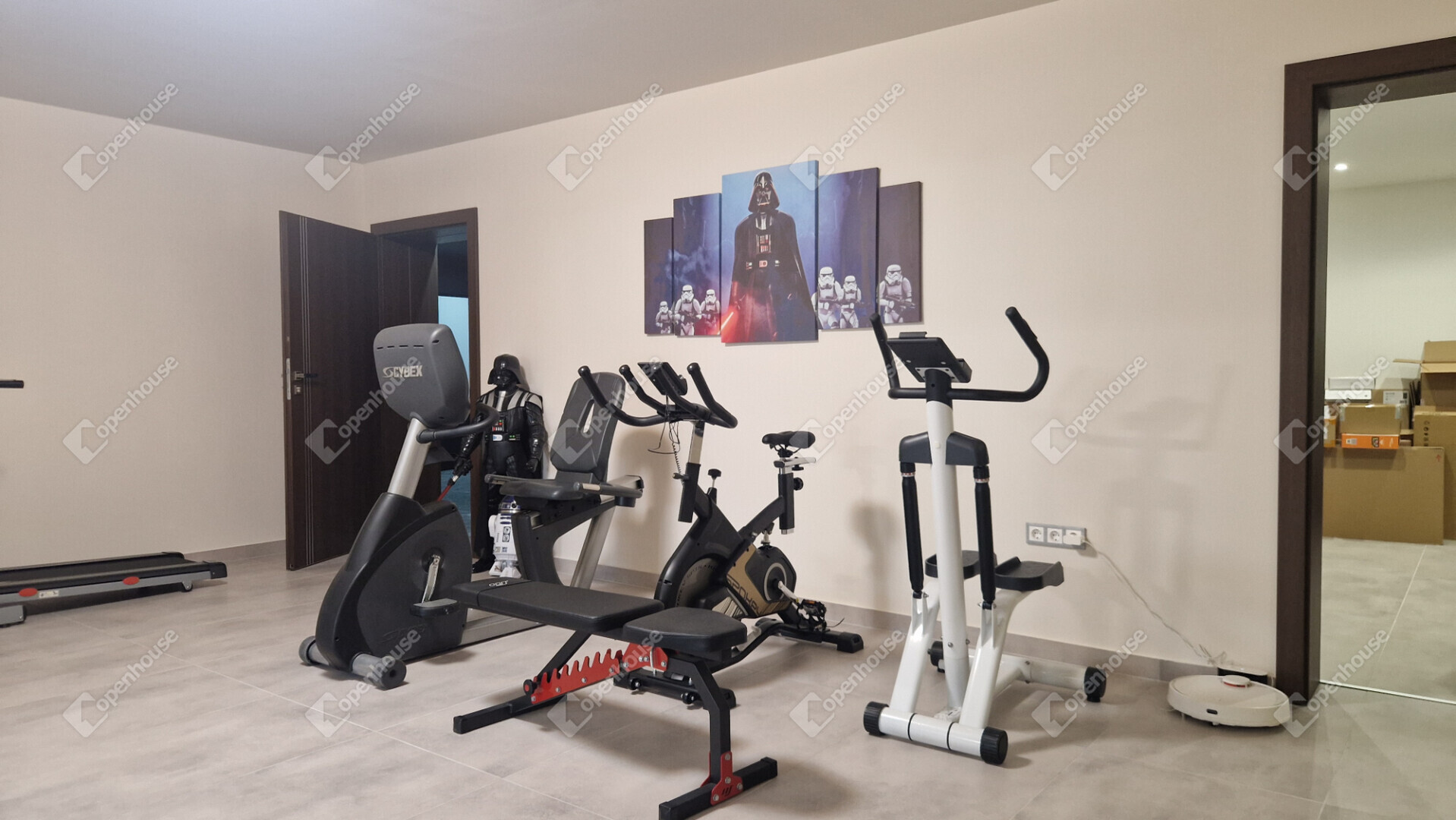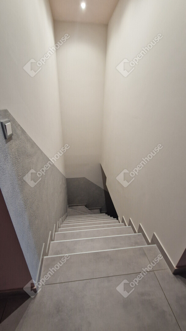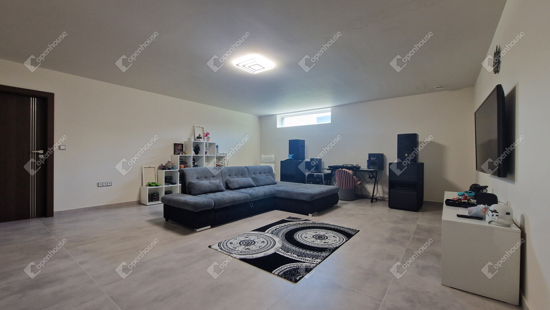 Szuterén részén kialakított helyiségek: lépcsőház-közlekedő, játszó szoba, kondi terem, hobby szoba, tároló, gépészeti helyiség, mozi szoba.