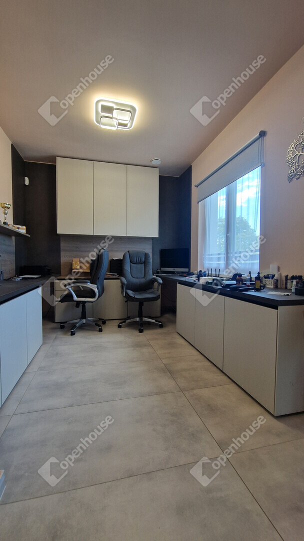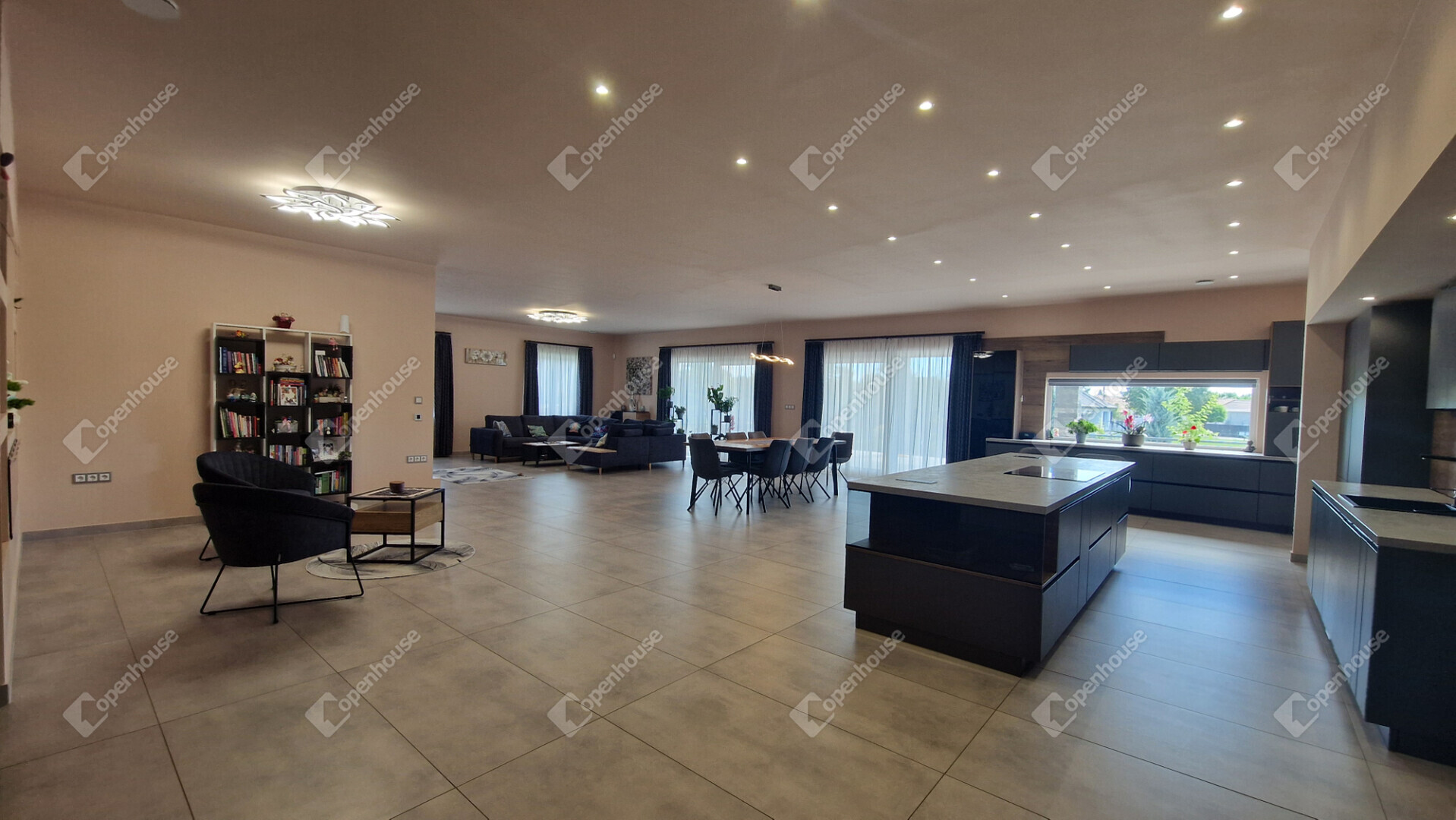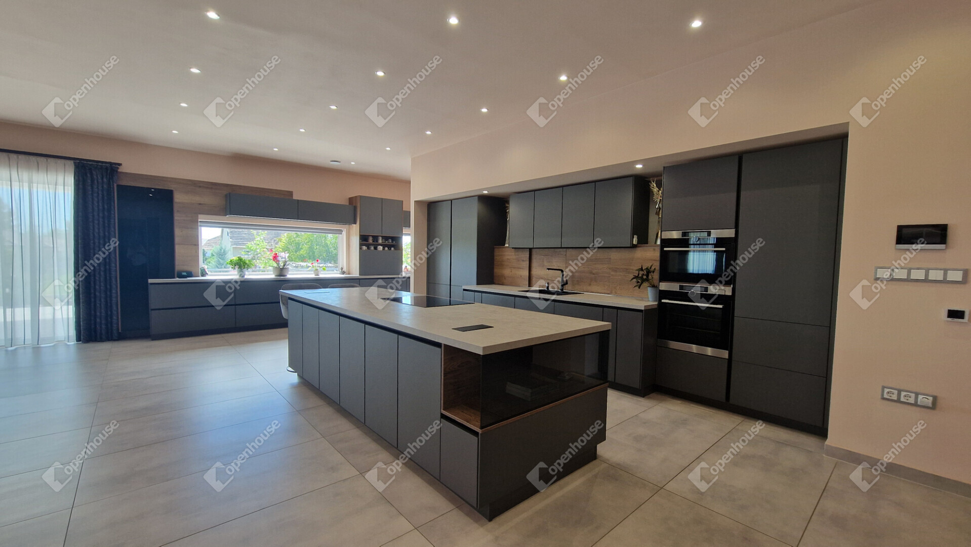 Földszinti részén kialakított terek: közlekedő, előszoba, dolgozó szoba, három fürdőszoba, három wc, szülői hálószoba hozzá kapcsolódó fürdőszobával, wc-vel, gardróbbal, tágas egyedi tervezésű konyha sziget, előkészítő, étkező, nappali, mosókonyha illetve négy külön nyíló szoba.