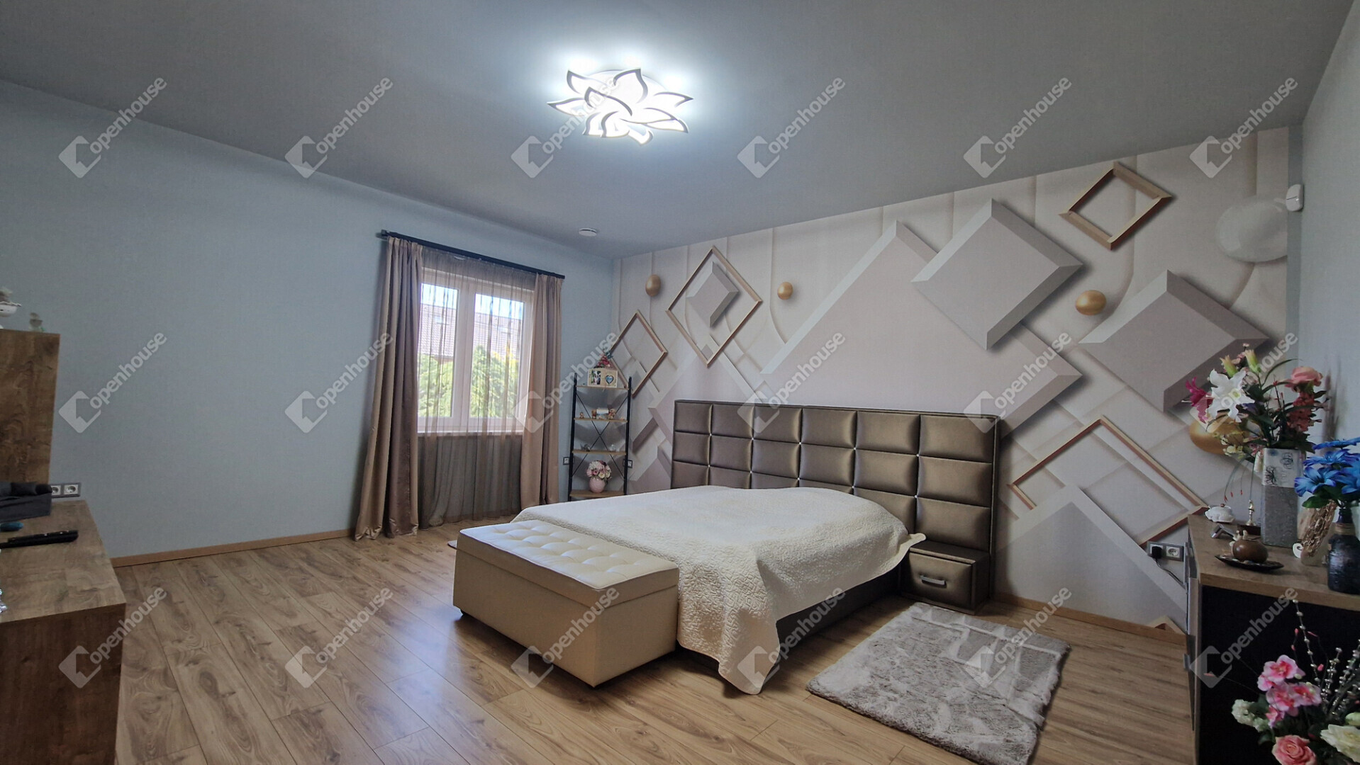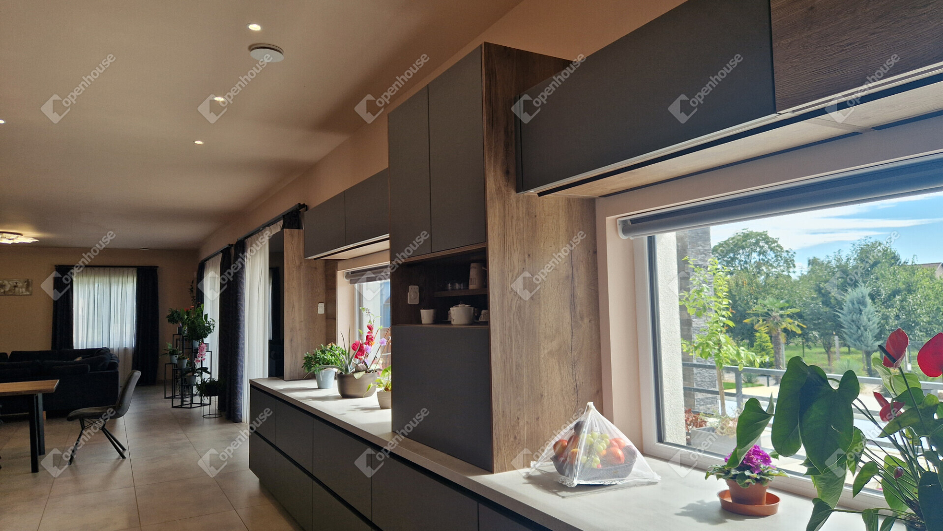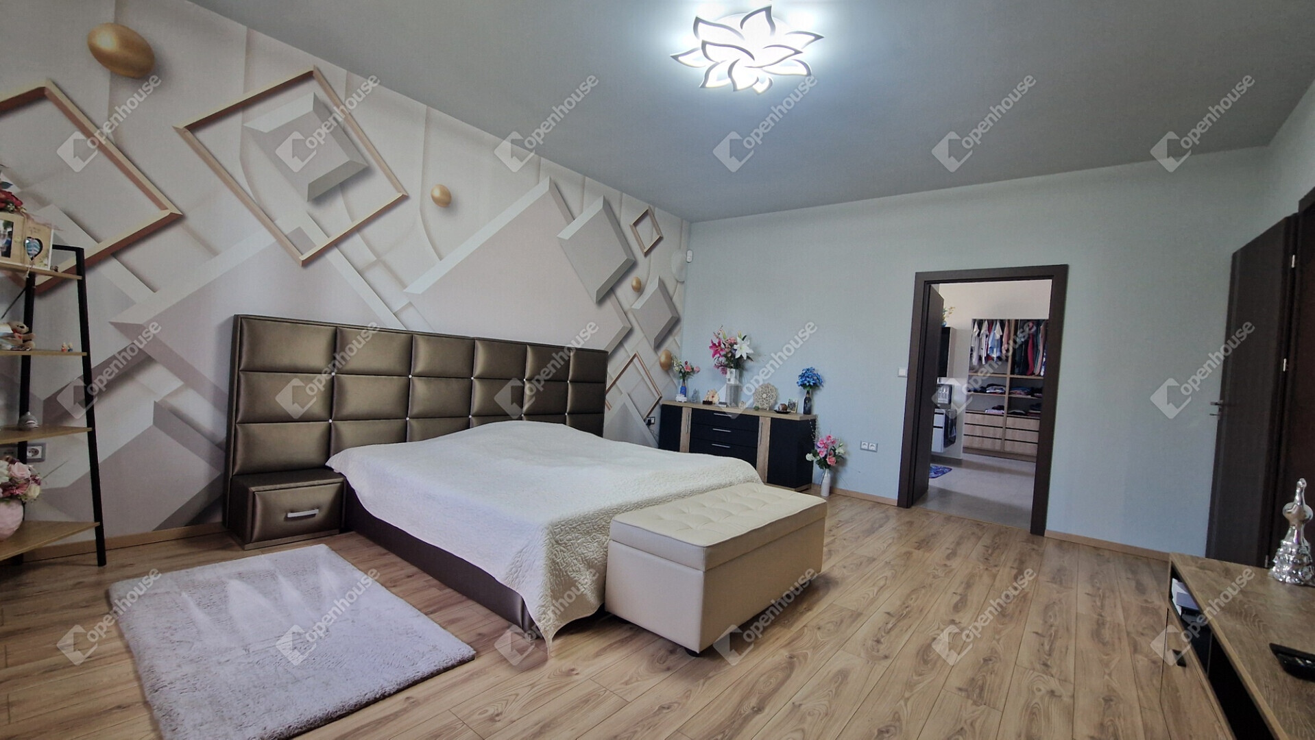 Földszinti részén kialakított terek: közlekedő, előszoba, dolgozó szoba, három fürdőszoba, három wc, szülői hálószoba hozzá kapcsolódó fürdőszobával, wc-vel, gardróbbal, tágas egyedi tervezésű konyha sziget, előkészítő, étkező, nappali, mosókonyha illetve négy külön nyíló szoba.