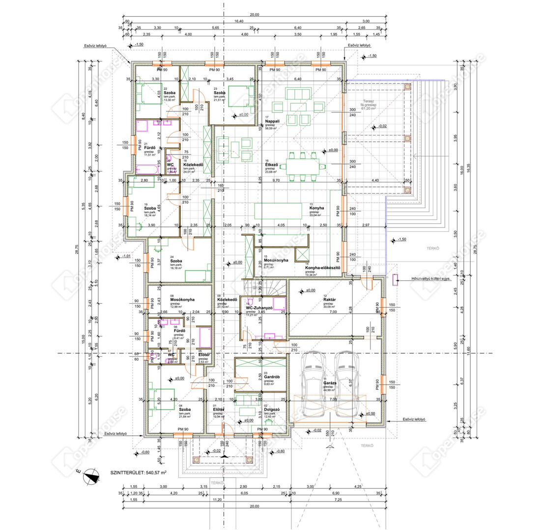 Két-három autó parkolására alkalmas fűthető garázs, tároló. (erről a részről is megközelíthető fedett terasz)