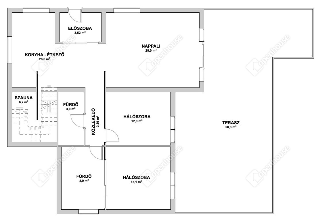 - Alapterület: 107 m² (nappali + 2 hálószoba)